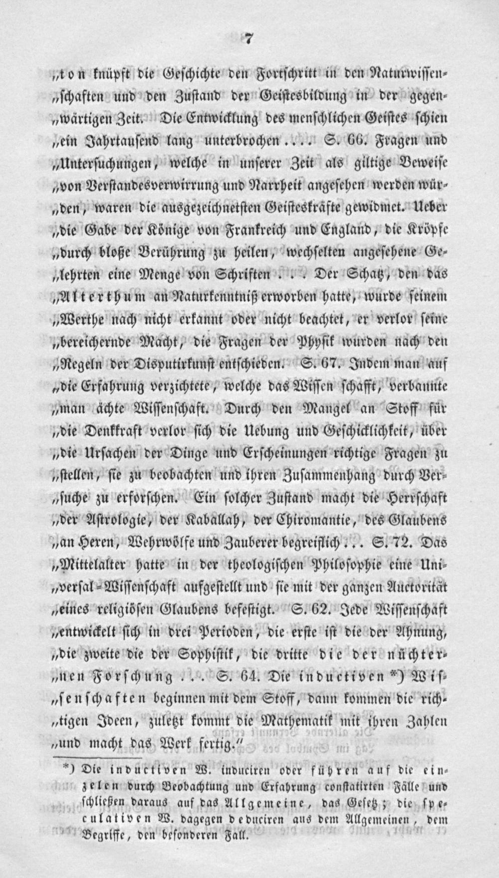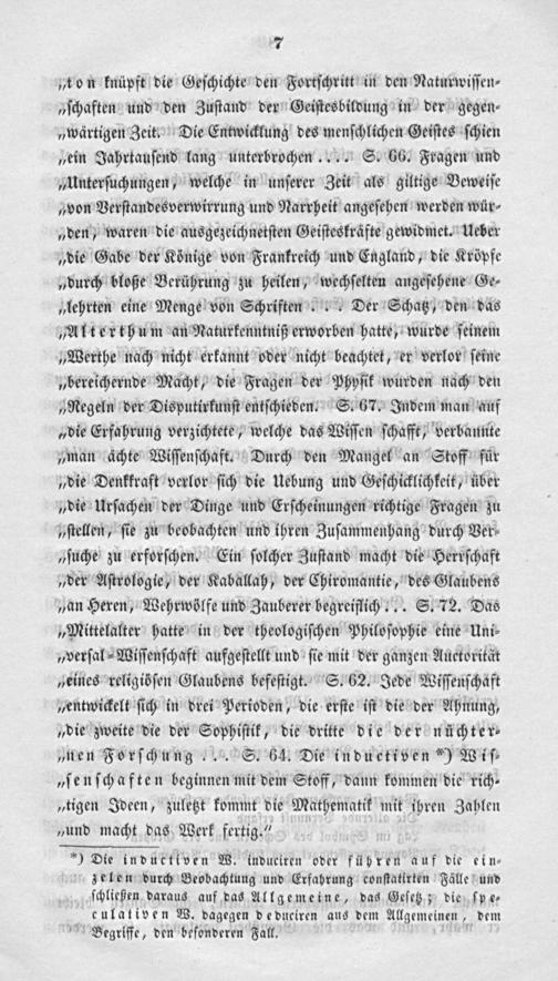 „ton knüpft die Geſchichte den Fortſchritt in den Naturwiſſen⸗ „ſchaften und den Zuſtand der Geiſtesbildung in der gegen⸗ „wärtigen Zeit. Die Entwicklung des menſchlichen Geiſtes ſchien „ein Jahrtauſend lang unterbrochen.... S. 66. Fragen und „Unterſuchungen, welche in unſerer Zeit als giltige Beweiſe „von Verſtandesverwirrung und Narrheit angeſehen werden wür⸗ „den, waren die ausgezeichnetſten Geiſteskräfte gewidmet. Ueber „die Gabe der Könige von Frankreich und England, die Kröpfe „durch bloße Berührung zu heilen, wechſelten angeſehene Ge⸗ „lehrten eine Menge von Schriften... Der Schatz, den das „Alterthum an Naturkenntniß erworben hatte, wurde ſeinem „Werthe nach nicht erkannt oder nicht beachtet, er verlor ſeine „bereichernde Macht, die Fragen der Phyſik wurden nach den „Regeln der Disputirkunſt entſchieden. S. 67. Indem man auf „die Erfahrung verzichtete, welche das Wiſſen ſchafft, verbannte „man achte Wiſſenſchaft. Durch den Mangel an Stoff für „die Denkkraft verlor ſich die Uebung und Geſchicklichkeit, über „die Urſachen der Dinge und Erſcheinungen richtige Fragen zu „ſtellen, ſie zu beobachten und ihren Zuſammenhang durch Ver⸗ „ſuche zu erforſchen. Ein ſolcher Zuſtand macht die Herrſchaft „der Aſtrologie, der Kaballah, der Chiromantie, des Glaubens „an Hexen, Wehrwölfe und Zauberer begreiflich... S. 72. Das „Mittelalter hatte in der theologiſchen Philoſophie eine Uni⸗ „verſal⸗Wiſſenſchaft aufgeſtellt und ſie mit der ganzen Auctorität geines religiöſen Glaubens befeſtigt. S. 62. Jede Wiſſenſchaft „entwickelt ſich in drei Perioden, die erſte iſt die der Ahnung, „die zweite die der Sophiſtik, die dritte die der nüchter⸗ „nen Forſchung... S. 64. Die inductiven*) Wiſ⸗ „ſenſchaften beginnen mit dem Stoff, dann kommen die rich⸗ „tigen Ideen, zuletzt kommt die Mathematik mit ihren Zahlen „und macht das Werk fertig.“ 1 3 Die inductiven W. induciren oder führen auf die ein⸗ zelen durch Beobachtung und Erfahrung conſtatirten Fälle und ſchließen daraus auf das Allgemeine, das Geſetz; die ſpe⸗