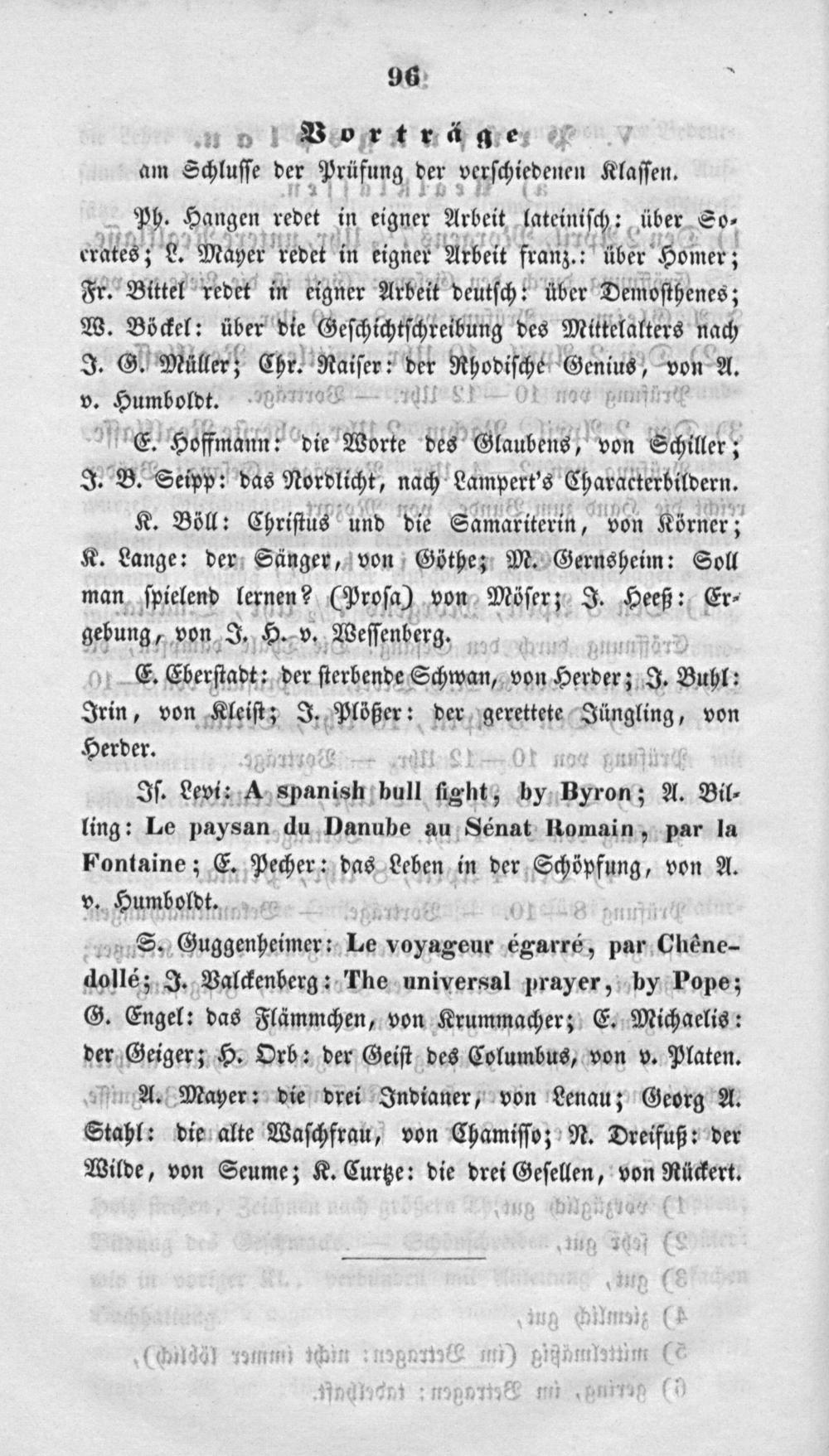 S. Guggenheimer: Le voyageur égarré, par Chene- dallé; J. Valckenberg: The universal prayer, by Pope; G. Engel: das Flämmchen, von Krummacher; E. Michaelis: der Geiger; H. Orb: der Geiſt des Columbus, von v. Platen.