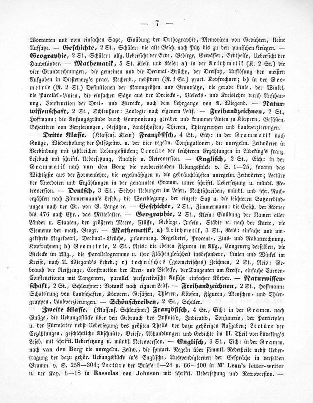 Dritte Klaſſe.(Klaſſenf. Klein) Franzöſiſch, 4 St., Eich: in der Grammatik nach Gnüge, Wiederholung der Hilfszeitw. u. der vier regelm. Conjugationen, die unregelm. Zeitwörter in Verbindung mit zahlreichen Uebungsſtücken; Lectüre der leichteren Erzählungen in Lüdeking's franz. Leſebuch mit ſchriftl. Ueberſetzung, Analyſe u. Retroverſion.— Engliſch, 2 St., Eich: in der Grammatik nach van den Berg die vorbereitenden Uebungsſtücke v. S. 1—25, ſodann das Wichtigſte aus der Formenlehre, die regelmäßigen u. die gebräuchlichſten unregelm. Zeitwörter; Lectüre der Aneedoten und Erzählungen in der genannten Gramm. unter ſchriftl. Ueberſetzung u. mündl. Re⸗ troverſion.— Deutſch, 3 St., Seipp: Uebungen im Leſen, Rechtſchreiben, mündl. und ſchr. Nach⸗ erzählen nach Zimmermann's Leſeb., die Wortbiegung, der einzele Satz u. die leichteren Satzverbind⸗ ungen nach der Gr. von G. Lange ꝛc.— Geſchichte, 2 St., Zimmermann: die Geſch. der Römer bis 476 nach Chr., das Mittelalter.— Geographie, 2 St., Klein: Einübung der Namen aller Länder u. Staaten, der größeren Meere, Flüſſe, Gebirge, Inſeln, Städte ꝛc. nach der Karte, die Elemente der math. Geogr.— Mathematik, a) Arithmetik, 3 St., Reis: einfache und um⸗ gekehrte Regeldetri, Decimal⸗Brüche, zuſammeng. Regeldetri, Procent⸗, Zins⸗ und Rabattrechnung, Kopfrechnen; b) Geometrie, 2 St., Reis: die ebenen Figuren im Allg., Congruenz derſelben, die Vielecke im Allg., die Parallelogramme u. ihre Flächengleichheit insbeſondere, Linien und Winkel im Kreiſe, nach A. Wiegand's Lehrb.; c) techniſches(geometriſches) Zeichnen, 2 St., Reis: Ge⸗ brauch der Reißzeuge, Conſtruction der Drei⸗ und Vielecke, der Tangenten am Kreiſe, einfache Curven⸗ Conſtructionen mit Tangenten, parallel perſpectiviſche Anſicht einfacher Körper.— Naturwiſſen⸗ ſchaft, 2 St., Schleußner: Votanik nach eignem Leitf.— Freihandzeichnen, 2 St., Hoffmann: Schattirung von Landſchaften, Körpern, Gefäßen, Thieren, Köpfen, Figuren, Menſchen⸗ und Thier⸗ gruppen, Laubverzierungen.— Schönſchreiben, 2 St., Schüler.