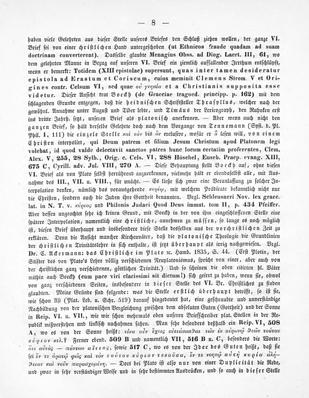 haben viele Gelehrten aus dieſer Stelle unſeres Briefes den Schluß ziehen wollen, der ganze VI. Brief ſei von einer chriſtlichen Hand untergeſchoben(ut Ethnicos fraude quadam ad suam doctrinam converterent). Dasſelbe glaubte Menagius Obss. ad Diog. Laert. III, 61, wo dem gelehrten Manne in Bezug auf unſeren VI. Brief ein ziemlich auffallender Irrthum entſchlüpft, wenn er bemerkt: Totidem(XIII epistolae) supersunt, quas inter tamen desideratur epistola ad Erastum et Coriscum, cuius meminit Clemens Strom V et Ori- gines contr. Celsum VI, sed quae ou pyyoia et a Christianis supposita esse videtur. Dieſer Anſicht trat Boeckh(de Graeciae tragoed. principp. p. 162) mit dem ſchlagenden Grunde entgegen, daß die heidniſchen Schriftſteller Thraſyllus, welcher nach der gewöhnl. Annahme unter Auguſt und Tiber lebte, und Timäus der Lexicograph, den Ruhnken erſt ins dritte Jahrh. ſetzt, unſeren Brief als platoniſch anerkennen.— Aber wenn auch nicht den ganzen Brief, ſo hält derſelbe Gelehrte doch nach dem Vorgange von Tennemann(Syſt. d. Pl. Phil. I, 111) die einzele Stelle„al 10» bis 5» ercluſive, wofür er 5 leſen will, von einem Chriſten interpolirt, qui Deum patrem et ſilium Jesum Christum apud Platonem legi volebat, id quod valde delectavit sanctos patres hunc locum certatim proferentes, Clem. Alex. V, 255, 28 Sylb., Orig. c. Cels. VI, 288 Höschel, Euseb. Praep. evang. XIII, 675 C, Cyrill. adv. Jul. VIII, 270 A.— Dieſe Behauptung ſtellt Boeckh auf, ohne dieſen VI. Brief als von Plato ſelbſt herrührend anzuerkennen, vielmehr hält er ebendaſelbſt alle, mit Aus⸗ nahme des III., VII. u. VIII., für unächt.— Es ließe ſich zwar eine Veranlaſſung zu ſolcher In⸗ terpolation denken, nämlich das vorausgehende 2νο, mit welchem Prädicate bekanntlich nicht nur die Chriſten, ſondern auch die Juden ihre Gottheit benannten. Vrgl. Schleusneri Nov. lex graec. lat. in N. T. v.*νιοο und Philonis Judaei Quod Deus immut. tom II, p. 434 Pfeiffer. Aber deſſen ungeachtet ſehe ich keinen Grund, mit Boeckh in der von ihm eingeſchloſſenen Stelle eine ſpätere Interpolation, namentlich eine chriſtliche, annehmen zu müſſen, ſo lange es noch möglich iſt, dieſen Brief überhaupt und insbeſondere dieſe Stelle desſelben aus der vorchriſtlichen Zeit zu erklären. Denn die Anſicht mancher Kirchenväter, daß die platoniſche Theologie die Grundlinien der chriſtlichen Trinitätslehre in ſich enthalte, iſt jetzt überhaupt als irrig nachgewieſen. Vrgl. Dr. C. Ackermann: das Chriſtliche im Plato ꝛc. Hamb. 1835, S. 44.(Erſt Plotin, der Stifter des von Plato's Lehre völlig verſchiedenen Neuplatonismus, ſpricht von einer, aber auch von der chriſtlichen ganz verſchiedenen, göttlichen Trinität.) Und ſo ſcheinen die oben citirten hl. Väter mithin auch Boeckh(cum pace viri clarissimi sit dictum!) ſich geirrt zu haben, wenn ſie, obwol von ganz verſchiedenen Seiten, insbeſondere in dieſer Stelle des VI. Br. Chriſtliches zu finden glaubten. Meine Gründe ſind folgende: was die Stelle erſtlich überhaupt betrifft, ſo iſt ſie, wie ſchon Aſt(Plat. Leb. u. Schr. 519) darauf hingedeutet hat, eine geſchraubte und unverſtändige Nachbildung von der platoniſchen Vergleichung zwiſchen dem abſoluten Guten(Gottheit) und der Sonne in Reip. VI. u. VII., wie wir ſchon mehrmals oben unſeren Briefſchreiber plat. Stellen in der Re⸗ publik mißverſtehen und linkiſch nachahmen ſahen. Man ſehe beſonders deßhalb ein Reip. VI, 508 A, wo es von der Sonne heißt: 0*α 0ν Exες αdτ⁴ςαανσα—ειν εν οςσσισι Ʒέιν τοντοι 4000 ll.? Ferner ebend. 509 B und namentlich VII, 516 B u. C, beſonders die Worte: d αχ— ⁴rroe⸗ αειος, ſowie 517 C, wo es von der Idee des Guten heißt, daß ſie ſei 5y 1e* 69⁶6m½αρς εαα τ r0010v kO10 re*odα, ky zs vOννι ιπν¶ οæ da⁷ Jιααν Qνα νοονχνιπραραασαννπ.— Dort bei Plato iſt alſo nur von einer Duplicität die Rede, und zwar in ſehr verſtändiger Weiſe und in ſehr beſtimmten Ausdrücken, und ſo auch in die ſer Stelle