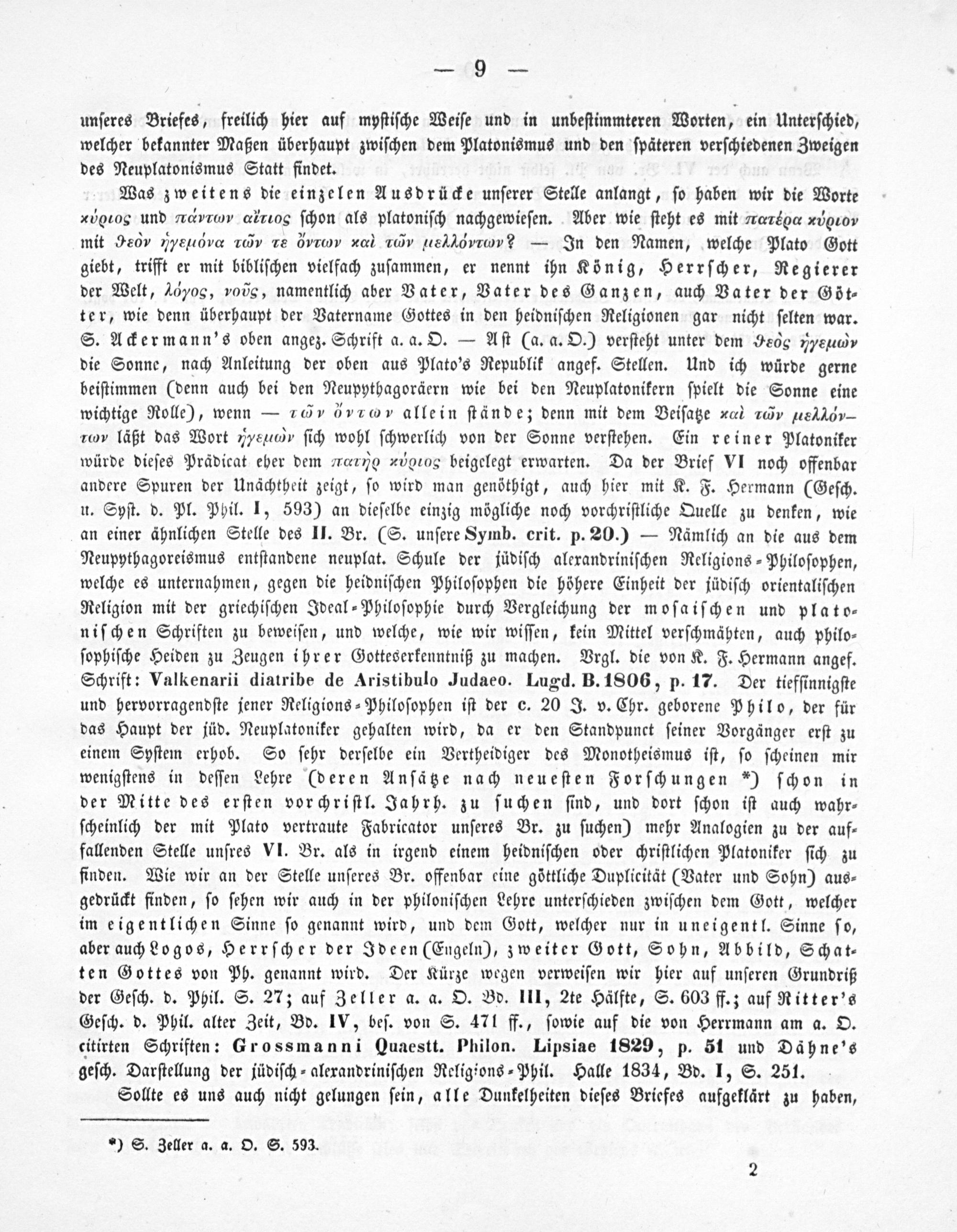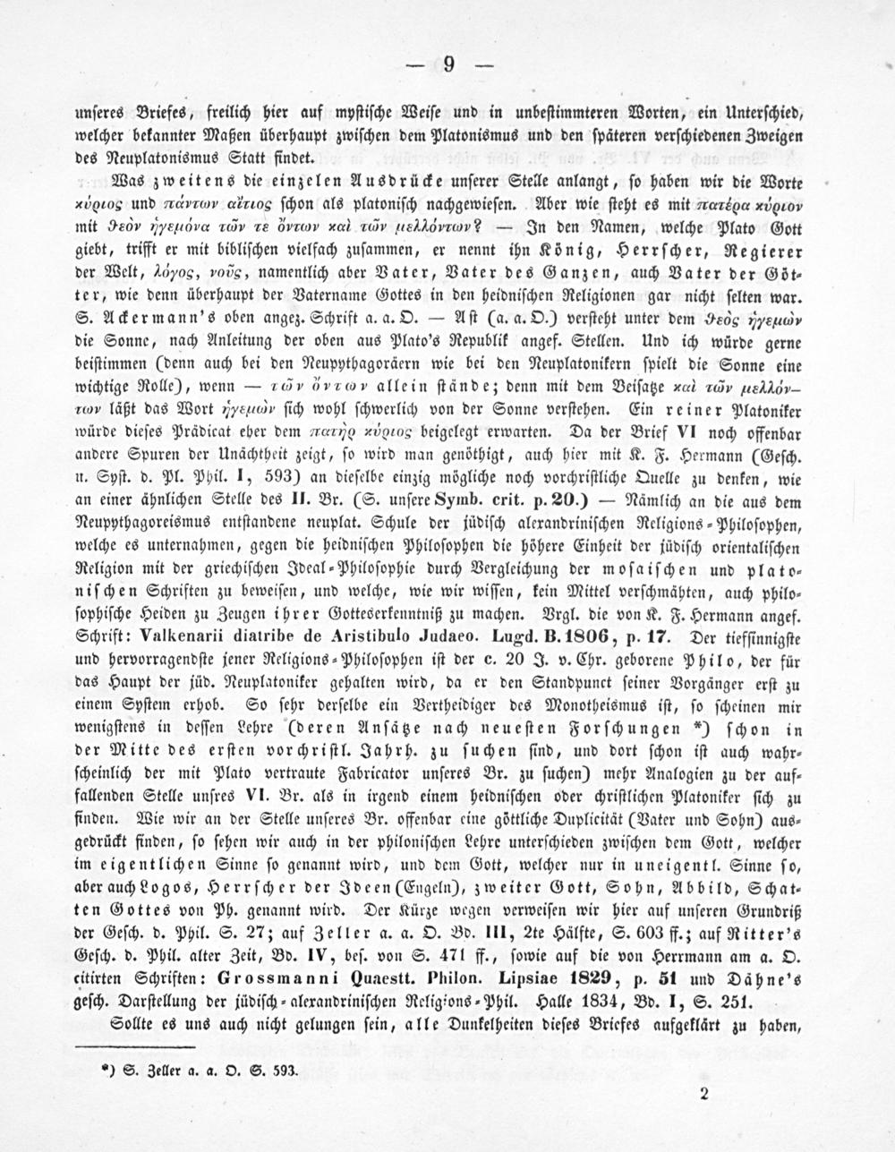 Was zweitens die einzelen Ausdrücke unſerer Stelle anlangt, ſo haben wir die Worte rdειοςα und ⁴eνμυωνsxτο*‿ ſchon als platoniſch nachgewieſen. Aber wie ſteht es mit τ⁴ιοαα ν*αιιον mit 9εν 1yερανυαα τιν τε νιννν ααά τνννν ιεα‿dνμιιν˙— In den Namen, welche Plato Gott giebt, trifft er mit bibliſchen vielfach zuſammen, er nennt ihn König, Herrſcher, Regierer der Welt, 16„,»oũg, namentlich aber Vater, Vater des Ganzen, auch Vater der Göt⸗ ter, wie denn überhaupt der Vatername Gottes in den heidniſchen Religionen gar nicht ſelten war. S. Ackermann's oben angez. Schrift a. a. O.— Aſt(a. a. O.) verſteht unter dem 9e0„pe2uεαe die Sonne, nach Anleitung der oben aus Plato's Republik angef. Stellen. Und ich würde gerne beiſtimmen(denn auch bei den Neupythagoräern wie bei den Neuplatonikern ſpielt die Sonne eine wichtige Rolle), wenn— 100„ by allein ſtände; denn mit dem Beiſatze„α ετό ν εαμεα‿α‿ςν rcy läßt das Wort„„e⁴ ſich wohl ſchwerlich von der Sonne verſtehen. Ein reiner Platoniker würde dieſes Prädicat eher dem rαια νοοοσ*ς beigelegt erwarten. Da der Brief VI noch offenbar andere Spuren der Unächtheit zeigt, ſo wird man genöthigt, auch hier mit K. F. Hermann(Geſch. u. Syſt. d. Pl. Phil. I, 593) an dieſelbe einzig mögliche noch vorchriſtliche Quelle zu denken, wie an einer ähnlichen Stelle des II. Br.(S. unſere Symb. crit. p. 20.)— Nämlich an die aus dem Neupythagoreismus entſtandene neuplat. Schule der jüdiſch alexandriniſchen Religions⸗Philoſophen, welche es unternahmen, gegen die heidniſchen Philoſophen die höhere Einheit der jüdiſch orientaliſchen Religion mit der griechiſchen Ideal⸗Philoſophie durch Vergleichung der moſaiſchen und plato⸗ niſchen Schriften zu beweiſen, und welche, wie wir wiſſen, kein Mittel verſchmähten, auch philo⸗ ſophiſche Heiden zu Zeugen ihrer Gotteserkenntniß zu machen. Vrgl. die von K. F. Hermann angef. Schrift: Valkenarii diatribe de Aristibulo Judaeo. Lugd. B. 1806, p. 17. Der tiefſinnigſte und hervorragendſte jener Religions⸗Philoſophen iſt der c. 20 J. v. Chr. geborene Philo, der für das Haupt der jüd. Neuplatoniker gehalten wird, da er den Standpunct ſeiner Vorgänger erſt zu einem Syſtem erhob. So ſehr derſelbe ein Vertheidiger des Monotheismus iſt, ſo ſcheinen mir wenigſtens in deſſen Lehre(deren Anſätze nach neueſten Forſchungen*) ſchon in der Mitte des erſten vorchriſtl. Jahrh. zu ſuchen ſind, und dort ſchon iſt auch wahr⸗ ſcheinlich der mit Plato vertraute Fabricator unſeres Br. zu ſuchen) mehr Analogien zu der auf⸗ fallenden Stelle unſres VI. Br. als in irgend einem heidniſchen oder chriſtlichen Platoniker ſich zu finden. Wie wir an der Stelle unſeres Br. offenbar eine göttliche Duplicität(Vater und Sohn) aus⸗ gedrückt finden, ſo ſehen wir auch in der philoniſchen Lehre unterſchieden zwiſchen dem Gott, welcher im eigentlichen Sinne ſo genannt wird, und dem Gott, welcher nur in uneigentl. Sinne ſo, aber auch Logos, Herrſcher der Ideen(Engeln), zweiter Gott, Sohn, Abbild, Schat⸗ ten Gottes von Ph. genannt wird. Der Kürze wegen verweiſen wir hier auf unſeren Grundriß der Geſch. d. Phil. S. 27; auf Zeller a. a. O. Bd. III, 2te Hälfte, S. 603 ff.; auf Ritter's Geſch. d. Phil. alter Zeit, Bd. IV, beſ. von S. 471 ff., ſowie auf die von Herrmann am a. O. citirten Schriften: Grossmanni(Quaestt. Philon. Lipsiae 1829, p. 51 und Dähne's geſch. Darſtellung der jüdiſch⸗alexandriniſchen Religions⸗Phil. Halle 1834, Bd. I, S. 251.