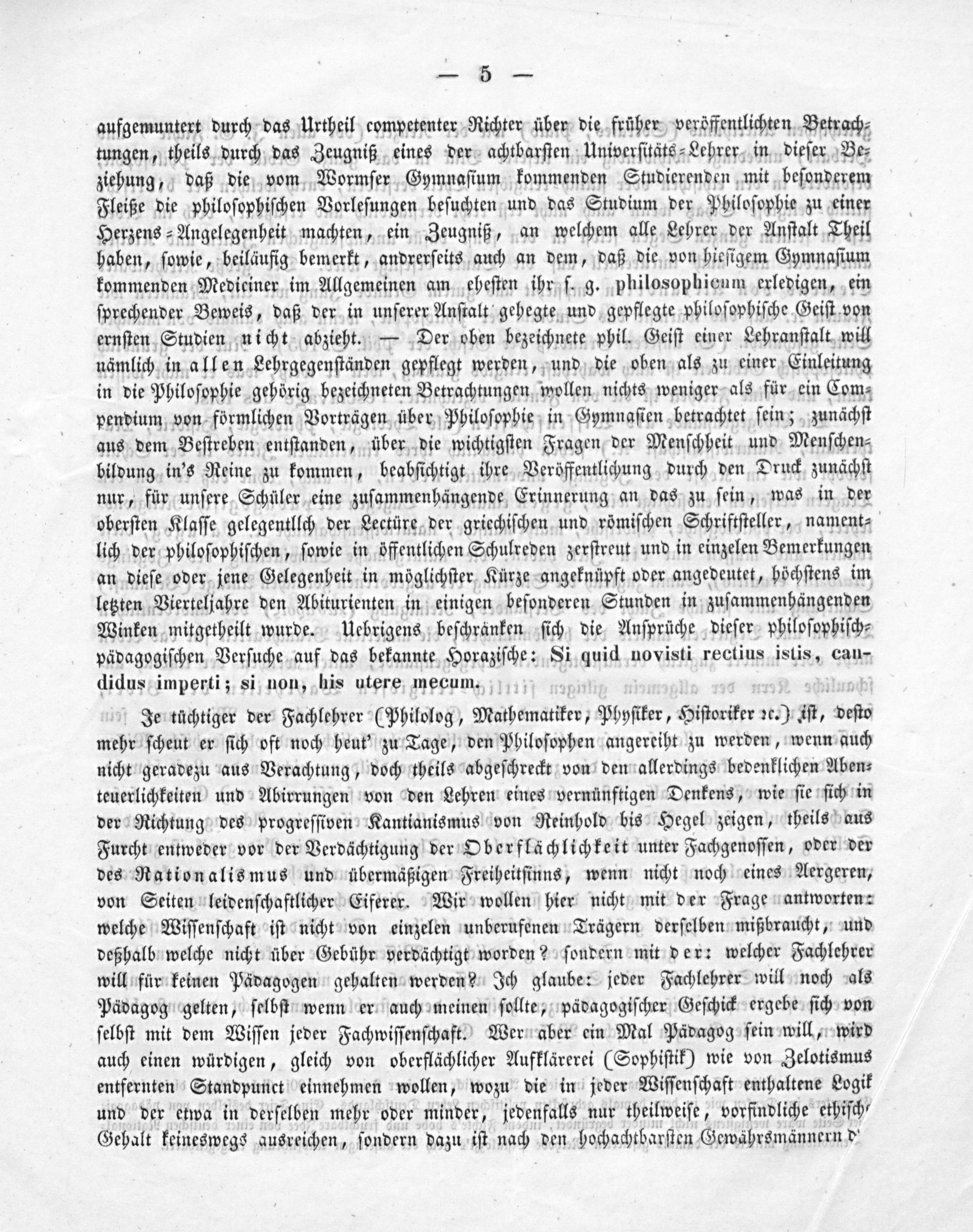 aufgemuntert durch das Urtheil competenter Richter über die früher vexöffentlichten Betrach⸗ tungen, theils durch das Zeugniß eines der achtbarſten Univerſitäts⸗Lehrer in dieſer Be⸗ ziebung, daß die vom Wormſer Gymnaſium kommenden Studierenden mit beſonderem Fleiße die philoſophiſchen Vorleſungen beſuchten und das Studium der Pbiloſophie zu einer Herzens⸗Angelegenheit machten, ein Zeugniß, an welchem alle Lehrer der Anſtalt Theil haben, ſowie, beiläufig bemerkt, andrerſeits auch an dem, daß die von hieſigem Gymnaſium kommenden Mediciner im Allgemeinen am eheſten ihr ſ. g. philosophicum erledigen, ein ſprechender Beweis, daß der in unſerer Anſtalt gehegte und gepflegte philoſophiſche Geiſt von ernſten Studien nicht abzieht.— Der oben bezeichnete phil. Geiſt einer Lehranſtalt will nämlich in allen Lehrgegenſtänden gepflegt werden, und die oben als zu einer Einleitung in die Philoſophie gehörig bezeichneten Betrachtungen wollen nichts weniger als für ein Com⸗ pendium von förmlichen Vorträgen über Philoſophie in Gymnaſien betrachtet ſein; zunächſt aus dem Beſtreben entſtanden, über die wichtigſten Fragen der Menſchheit und Menſchen⸗ bildung in's Reine zu kommen, beabſichtigt ihre Veröffentlichung durch den Druck zunächſt nur, für unſere Schüler eine zuſammenhängende Erinnerung an das zu ſein, was in der oberſten Klaſſe gelegentllch der Lectüre der griechiſchen und römiſchen Schriftſteller, nament⸗ lich der philoſophiſchen, ſowie in öffentlichen Schulreden zerſtreut und in einzelen Bemerkungen an dieſe oder jene Gelegenheit in möglichſter Kürze angeknüpft oder angedeutet, höchſtens im letzten Vierteljahre den Abiturienten in einigen beſonderen Stunden in zuſammenhängenden Winken mitgetheilt wurde. Uebrigens beſchranken ſich die Anſprüche dieſer philoſophiſch⸗ pädagogiſchen Verſuche auf das bekannte Horaziſche: Si quid novisti rectius istis, cau- didus imperti; si non, his utere mecum.
