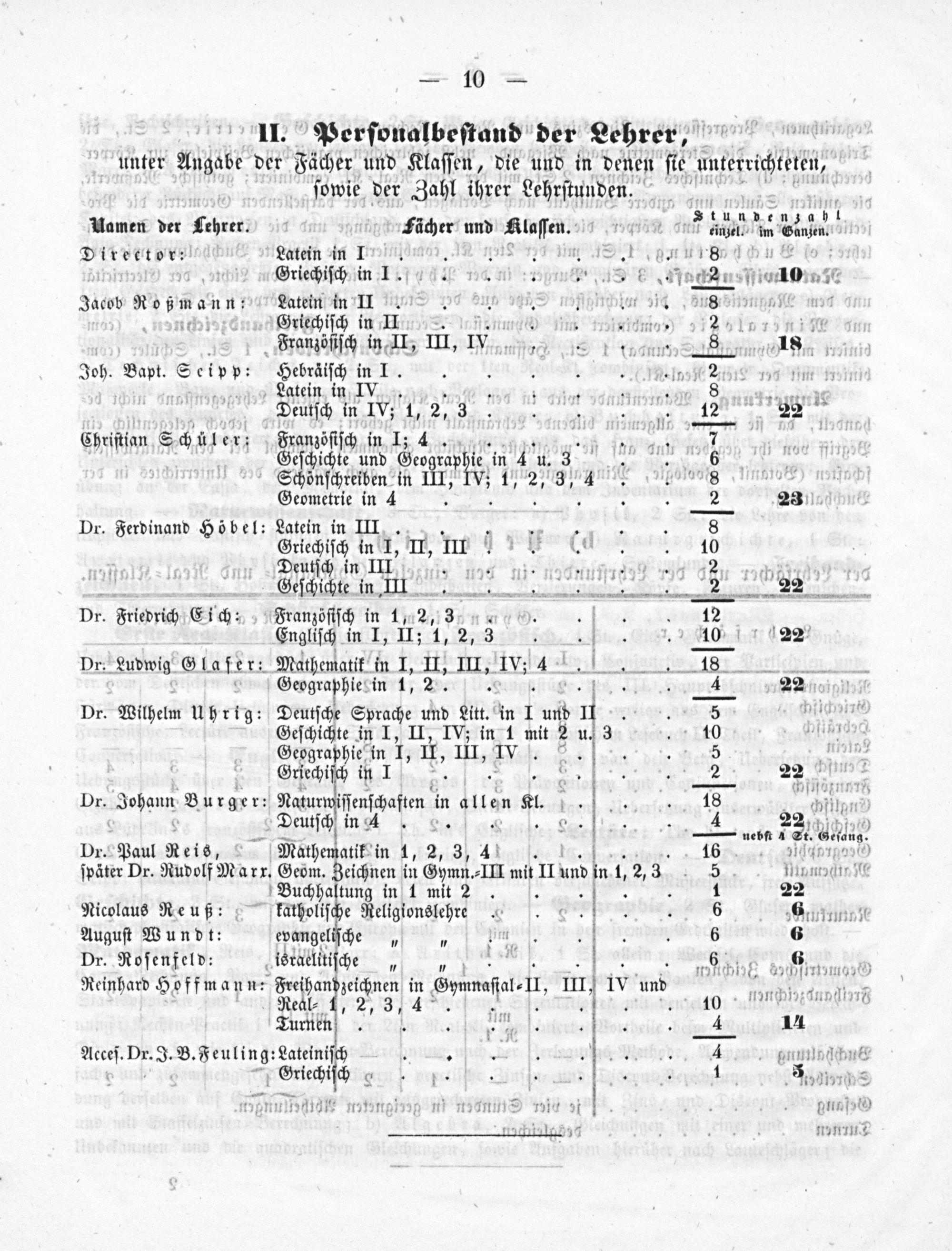 Uamen der Lehrer. Fächer und Klaſſen.* 12 un 2⸗ 2e Director: Latein in Iw in. 1. I. 718 v. nin. 1=.1. g. u 1·85 d h u 1 1 12„Griechiſch in I. 14. ni:: 5 k 2. l0 916 Jacob Roßmann: Latein in II 39 31.. Aohchlur u. 27E m . ich Griechiſch in II. e me i ee⸗ 11 M . Franzöſiſch in II, III, IV e nn 18 Joh. Bapt. Sceipp: Hebräiſch in 1. 7 n Latein in IV. Deutſch in IV; 1, 2, 3 1i inel 22 Chriſtian Schüler; Franzöſiſch in I; 4.. Geſchichte und Geographi ie in 4 u. 3 1 1 Schönſchreiben in IIImIVI 1nu2 A 4 1 Geometrie in 4. 23 Dr. Ferdinand Höbel: Latein in III. Griechiſch in I, II, III Deutſch in IIl'. b Geſchichte in III—— 22 Dr. Friedrich Eich: Franzöſiſch in 1, 2, 3 1... Engliſch in I, II; 1, 2, 3 1.. 122 Dr. Ludwig Glaſer: Mathematik in 1, II. III, IV: 4——— Geographie: in 1, 2....... 22