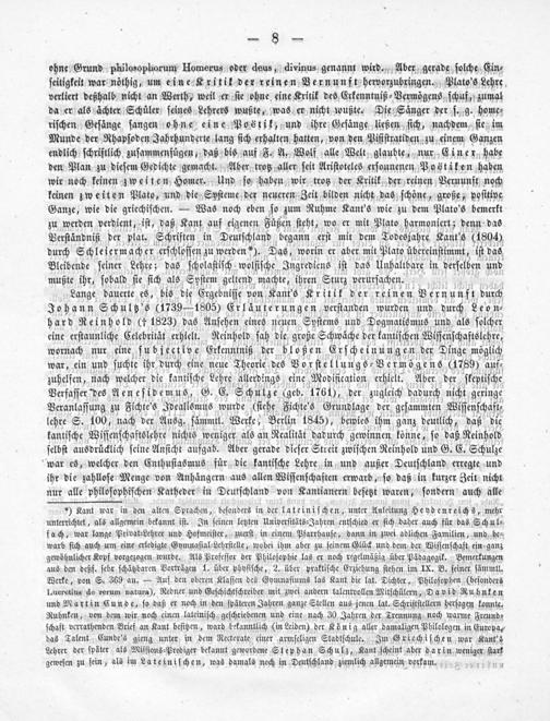 Lange dauerte es, bis die Ergebniſſe von Kant's Kritik der reinen Bernunft durch Johann Schultz's(1739— 1805) Erläuterungen verſtanden wurden und durch Leon⸗ hard Reinhold(† 1823) das Anſehen eines neuen Syſtems und Dogmatismus und als ſolcher eine erſtaunliche Celebrität erhielt. Reinhold ſah die große Schwäche der kantiſchen Wiſſenſchaftslehre, wornach nur eine ſubjective Erkenntniß der bloßen Erſcheinungen der Dinge möglich war, ein und ſuchte ihr durch eine neue Theorie des Vorſtellungs⸗ Vermögens(1789) auf⸗ zuhelfen, nach welcher die kantiſche Lehre allerdings eine Modiſication erhielt. Aber der ſteptiſche Verfaſſer des Aeneſidemus, G. E, Schulze(geb. 1761), der zugleich dadurch nicht geringe Veranlaſſung zu Fichte's Idealismus wurde(ſtehe Fichte's Grundlage der geſammten Wiſſenſchaft⸗ lehre S. 100, nach der Ausg. ſämmtl. Werke, Berlin 1845), bewies ihm ganz deutlich, daß die kantiſche Wiſſenſchaftslehre nichts weniger als an Realität dadurch gewinnen könne, ſo daß Reinhold ſelbſt ausdrücklich ſeine Anſicht aufgab. Aber gerade dieſer Streit zwiſchen Reinhold und G. E. Schulze war es, welcher den Enthuſiasmus für die kantiſche Lehre in und außer Deutſchland erregte und ihr die zahlloſe Menge von Anhängern aus allen Wiſſenſchaften erwarb, ſo daß in kurzer Zeit nicht nur alle philoſophiſchen Katheder in Deutſchland von Kantianern beſetzt waren, ſondern auch alle