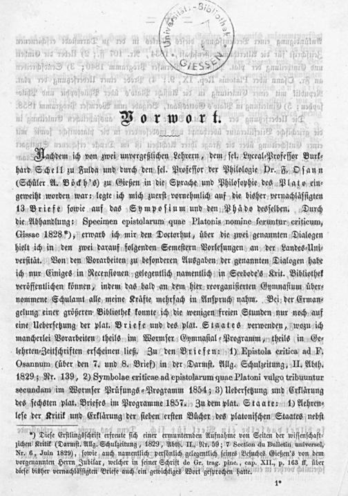 nn Ilachdem ich von zwei unvergeßlichen Lehrern, dem ſel. Lyceal⸗Profeſſor Burk⸗ hard Schell zu Fulda und durch den ſel. Profeſſor der Philologie Dr. F. Oſann (Schüler A. Böckh's) zu Gießen in die Sprache und Philoſophie des Plato ein⸗ geweiht worden war: legte ich mich zuerſt vornehmlich auf die bisher vernachläſſigten 13 Briefe ſowie auf das Sympoſium und den Phädo desſelben. Durch die Abhandlung: Specimen epistolarum quae Platonis nomine feruntur criticum, Gissae 1828*), erwarb ich mir den Doctorhut, über die zwei genannten Dialogen hielt ich in den zwei darauf folgenden Semeſtern Vorleſungen an der Landes⸗Uni⸗ verſität. Von den Vorarbeiten zu beſonderen Ausgaben der genannten Dialogen habe ich nur Einiges in Recenſionen gelegentlich namentlich in Seebode's Krit. Bibliothek veröffentlichen können, indem das bald an dem hier reorganiſierten Gymnaſium über⸗ nommene Schulamt alle meine Kräfte mehrfach in Anſpruch nahm. Bei der Erman⸗ gelung einer größeren Bibliothek konnte ich die wenigen freien Stunden nur noch auf eine Ueberſetzung der plat. Briefe und des plat. Staates verwenden, wozu ich mancherlei Vorarbeiten theils im Wormſer Gymnaſial⸗Programm, theils in Ge⸗ lehrten⸗Zeitſchriften erſcheinen ließ. Zu den Briefen: 1) Epistola critica ad F. Osannum(über den 7. und 8. Brief) in der Darmſt. Allg. Schulzeitung, II. Abth. 1829 6 Nr. 139, 2) Symbolae criticae ad epistolarum quae Platoni vulgo tribuuntur secundam im Wormſer Prüfungs⸗Programm 1854; 3) Ueberſetzung und Erklärung des ſechsten plat. Briefes im Programme 1857. Zu dem plat. Staate: 1) Aehren⸗ leſe der Kritik und Erklärung der ſieben erſten Bücher des platoniſchen Staates nebſt Dieſe Erſtlingsſchtift erfreute ſich einer ermunternden Aufnahme von Seiten der wiſſenſchaft⸗ lichen Kritik(Darmſt. Allg. Schulzeitung, 1829, Abth. II., Nr. 59; 7 Section du Bulletin universel, Nr. 6, Juin 1829), ſowie auch namentlich perſöͤnlich gelogentlich ſeines Beſuches Gießen’s von dem
