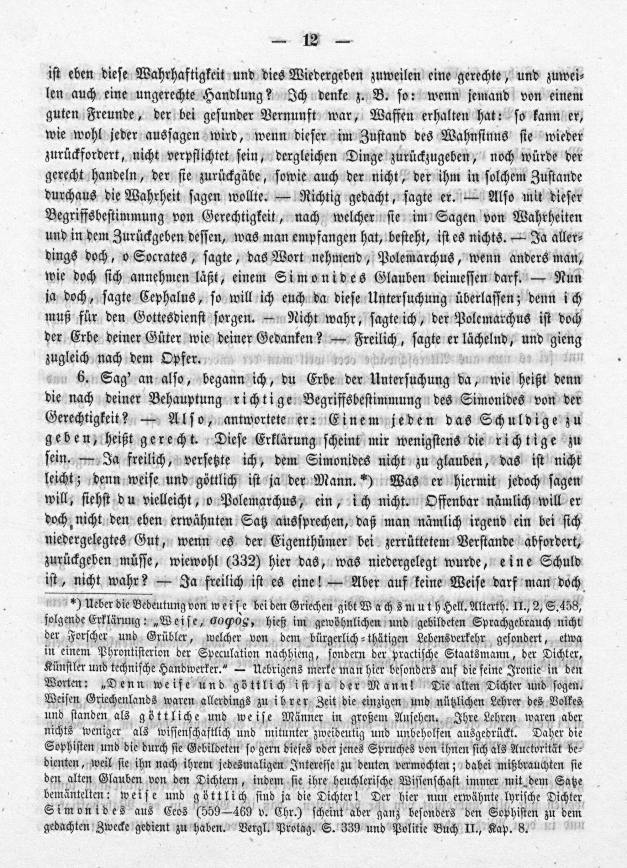 6. Sag' an alſo, begann ich, du Erbe dder Unterſachung d, wie heißt denn die nach deiner Behauptung richtige Begriffsbeſtimmung des Simonides von der Gerechtigkeit?— Alſo, antwortete er: Einem jeden das Schuldige zu geben, heißt gerecht. Dieſe Erklärung ſcheint mir wenigſtens die richtige zu ſein.— Ja freilich, verſetzte ich, dem Simonides nicht zu glauben, das iſt nicht leicht; denn weiſe und göttlich iſt ja der Mann.*) Was er hiermit jedoch ſagen will, ſiehſt du vielleicht, o Polemarchus, ein, ich nicht. Offenbar nämlich will er doch nicht den eben erwähnten Satz ausſprechen, daß man nämlich irgend ein bei ſich niedergelegtes Gut, wenn es der Eigenthümer bei zerrüttetem Verſtande abfordert, zurückgeben müſſe, wiewohl(332) hier das, was niedergelegt wurde, eine Schuld iſt, nicht wahr?— Ja freilich iſt es eine!— Aber auf keine Weiſe darf man doch