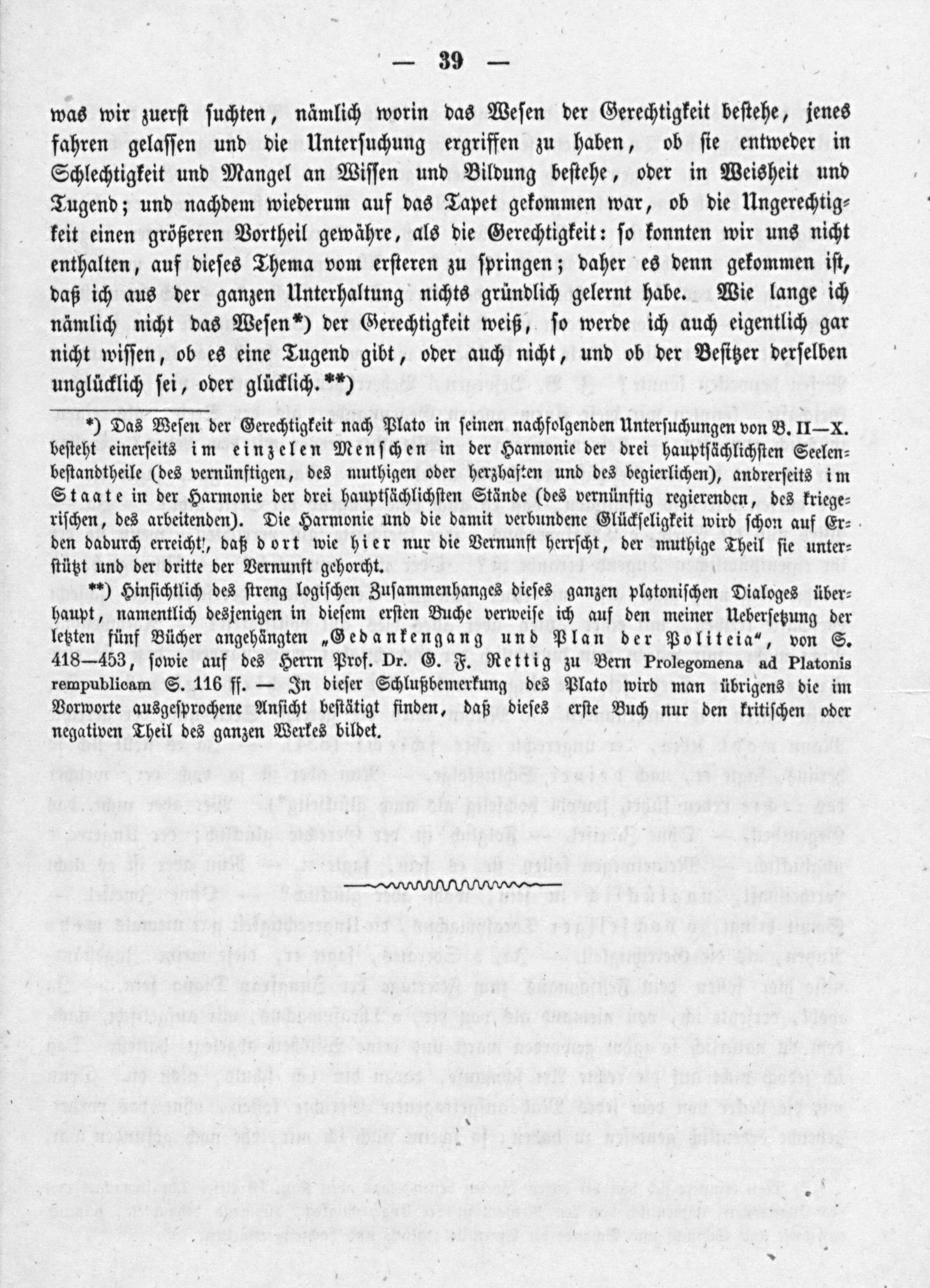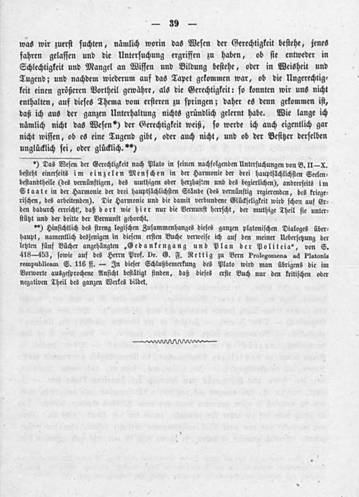 *) Hinſichtlich des ſtreng logiſchen Zuſammenhanges dieſes ganzen platoniſchen Dialoges über⸗ haupt, namentlich desjenigen in dieſem erſten Buche verweiſe ich auf den meiner Ueberſetzung der letzten fünf Bücher angehängten„Gedankengang und Plan der Politeia“, von S. 418— 453, ſowie auf des Herrn Prof. Dr. G. F. Rettig zu Bern Prolegomena ad Platonis rempublicam S. 116 ff.— In dieſer Schlußbemerkung des Plato wird man übrigens die im Vorworte ausgeſprochene Anſicht beſtätigt finden, daß dieſes erſte Buch nur den kritiſchen oder negativen Theil des ganzen Werkes bildet.