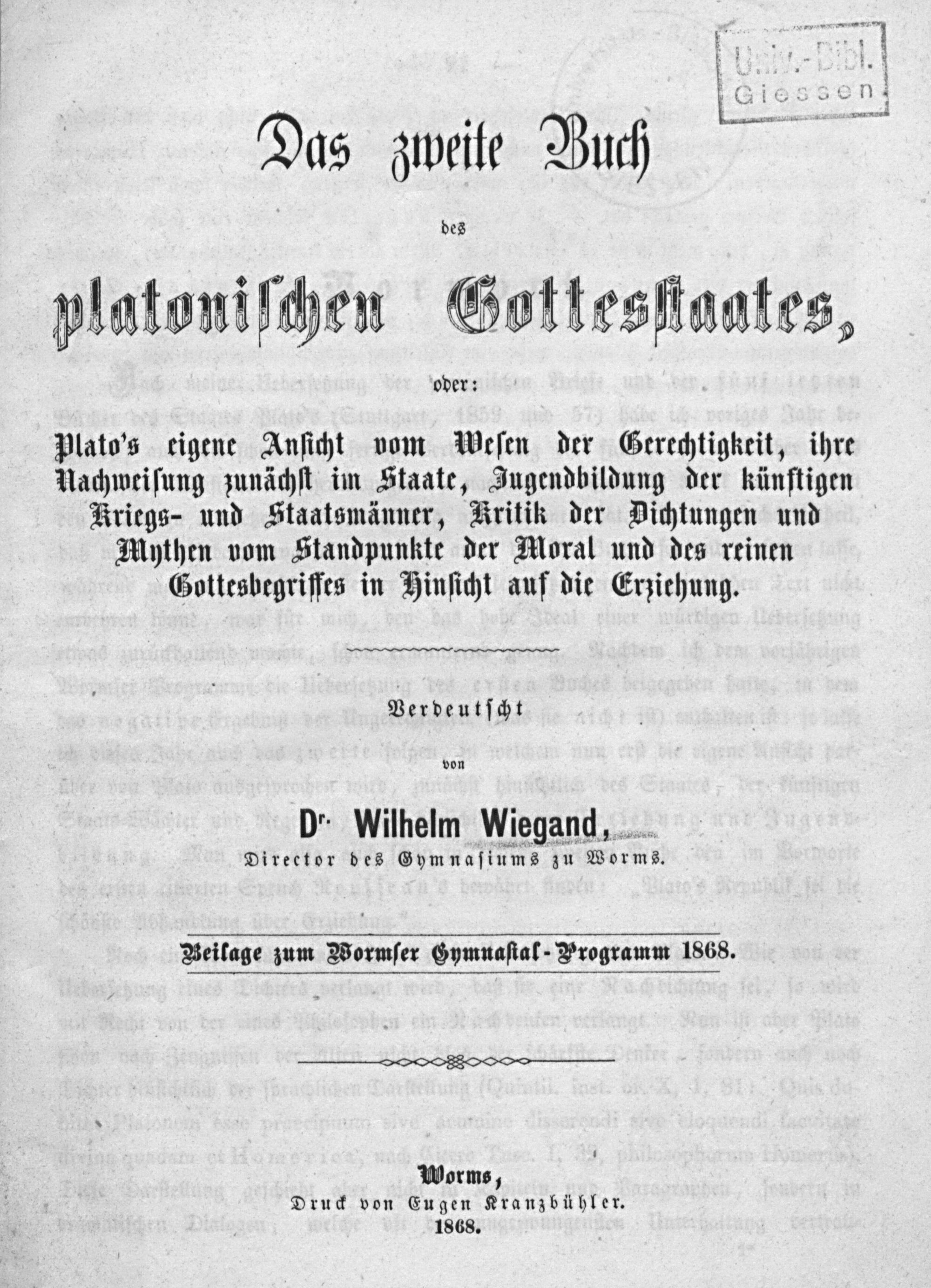 Plato's eigene Anſicht vom Weſen der Gerechtigkeit, ihre Nachweiſung zunächſt im Staate, Zugendbildung der künſtigen Kriegs- und Staatsmänner, KRritik der Dichtungen und Mythen vom Standpunkte der Moral und des reinen Gottesbegriffes in Hinſicht auf die Erzichung.