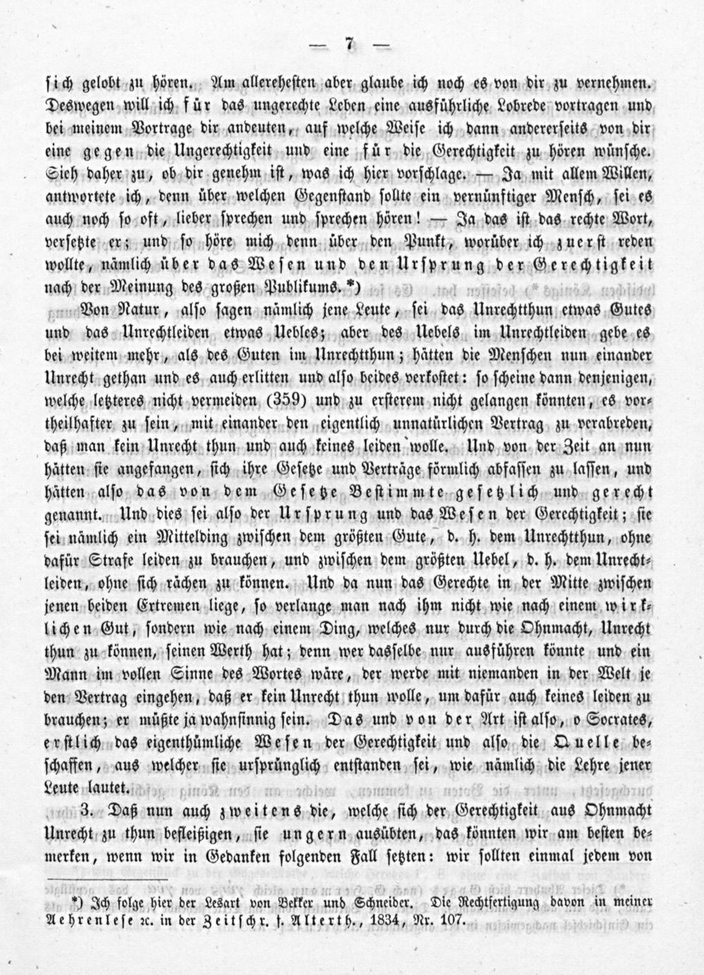 ſich gelobt zu hören. Am allereheſten aber glaube ich noch es von dir zu vernehmen. Deswegen will ich für das ungerechte Leben eine ausführliche Lobrede vortragen und bei meinem Vortrage dir andeuten, auf welche Weiſe ich dann andererſeits von dir eine gegen die Ungerechtigkeit und eine für die Gerechtigkeit zu hören wünſche. Sieh daher zu, ob dir genehm iſt, was ich hier vorſchlage.— Ja mit allem Willen, antwortete ich, denn über welchen Gegenſtand ſollte ein vernünftiger Menſch, ſei es auch noch ſo oft, lieber ſprechen und ſprechen hören!— Ja das iſt das rechte Wort, verſetzte er; und ſo höre mich denn über den Punkt, worüber ich zuerſt reden wollte, nämlich über das Weſen und den Urſprung der Gerechtigkeit nach der Meinung des großen Publikums.*)