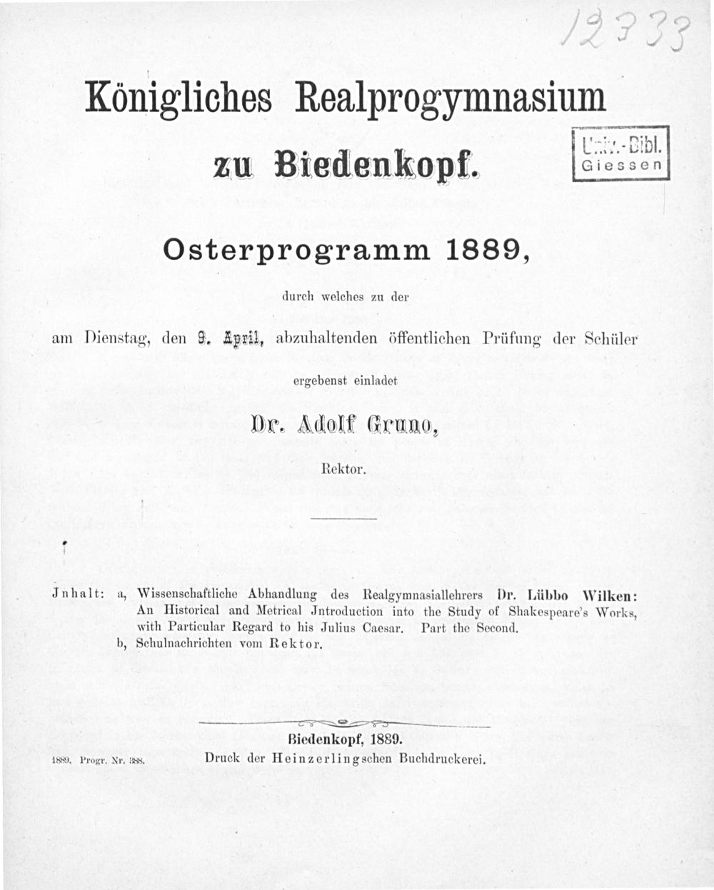 Inhalt: a, Wissenschaftliche Abhandlung des Realgymnasiallehrers Dr. Lübbo Wilken: An Hiistorical and Metrical JIntroduction into the Study of Shakespeare's Works, with Particular Regard to his Julius Caesar. Part the Second.