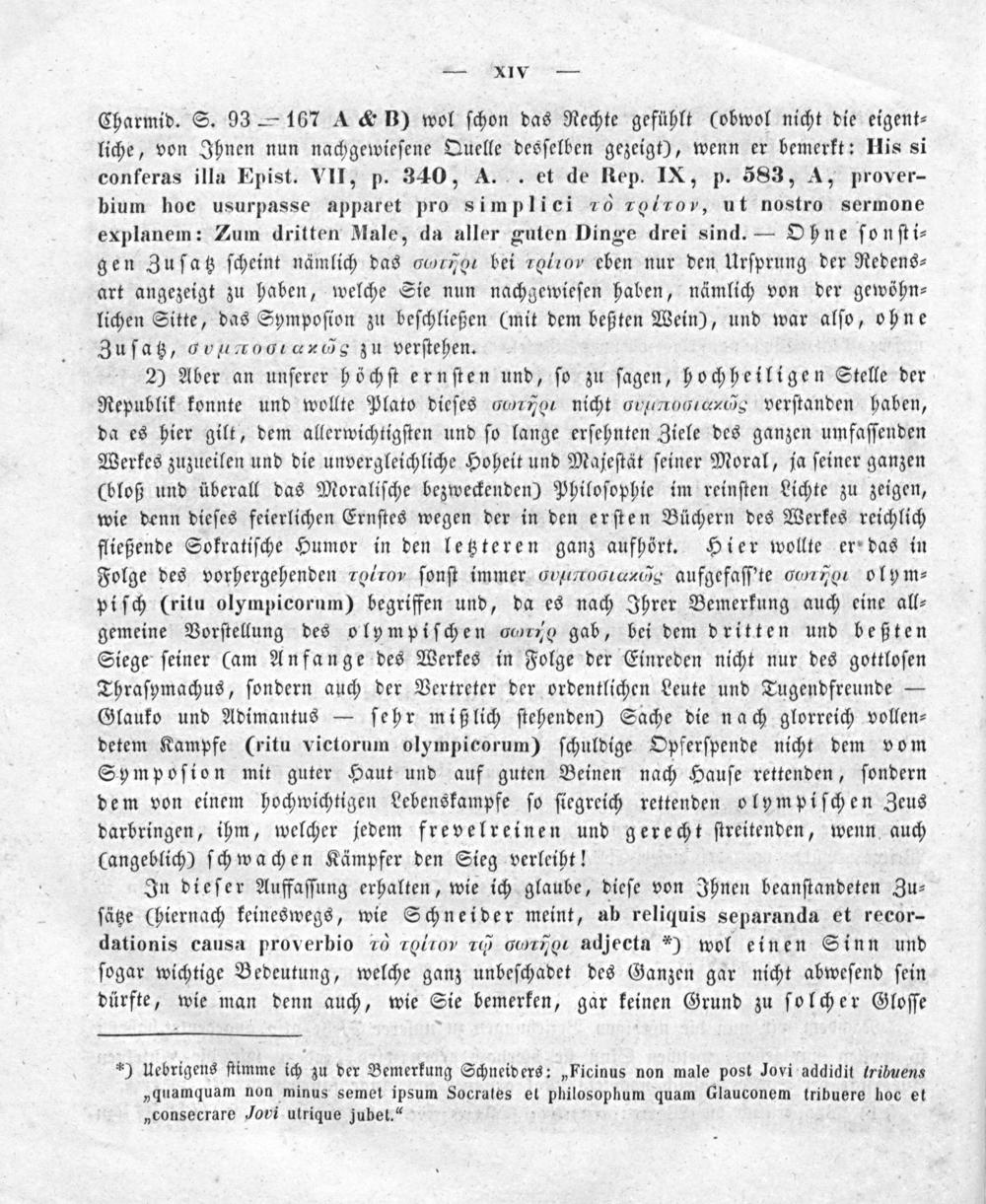 2) Aber an unſerer höchſt ernſten und, ſo zu ſagen, hochheiligen Stelle der Republik konnte und wollte Plato dieſes 0111l0% qIõicht Gιό ⁰ο8 verſtanden haben, da es hier gilt, dem allerwichtigſten und ſo lange erſehnten Ziele des ganzen umfaſſenden Werkes zuzueilen und die unvergleichliche Hoheit und Majeſtät ſeiner Moral, ja ſeiner ganzen (bloß und überall das Moraliſche bezweckenden) Philoſophie im reinſten Lichte zu zeigen, wie denn dieſes feierlichen Ernſtes wegen der in den erſten Büchern des Werkes reichlich fließende Sokratiſche Humor in den letzteren ganz aufhört. Hier wollte er das in Folge des vorhergehenden 1010„ ſonſt immer Gηηι60 ä aufgefaſſ'te dνο olym⸗ piſch(ritu olympicorum) begriffen und, da es nach Ihrer Bemerkung auch eine all⸗ gemeine Vorſtellung des olympiſchen orne gab, bei dem dritten und beßten Siege ſeiner(am Anfange des Werkes in Folge der Einreden nicht nur des gottloſen Thraſymachus, ſondern auch der Vertreter der ordentlichen Leute und Tugendfreunde— Glauko und Adimantus— ſehr mißlich ſtehenden) Sache die nach glorreich vollen⸗ detem Kampfe(ritu victorum olympicorum) ſchuldige Opferſpende nicht dem vom Sympoſion mit guter Haut und auf guten Beinen nach Hauſe rettenden, ſondern dem von einem hochwichtigen Lebenskampfe ſo ſiegreich rettenden olympiſchen Zeus darbringen, ihm, welcher jedem frevelreinen und gerecht ſtreitenden, wenn auch (angeblich) ſchwachen Kämpfer den Sieg verleiht!