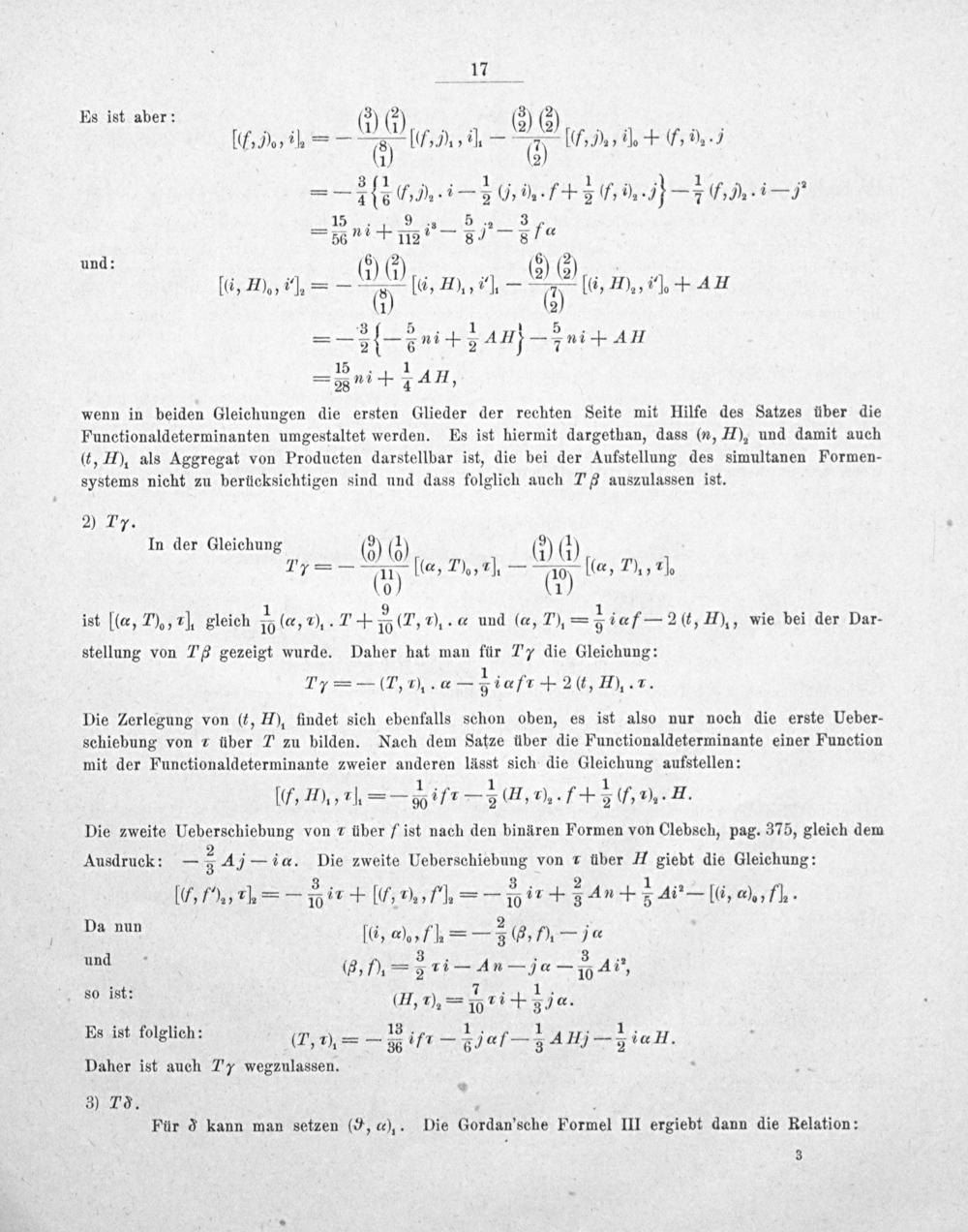 Die Zerlegung von(t, H), findet sich ebenfalls schon oben, es ist also nur noch die erste Ueber- schiebung von ⁊ über 7 zu bilden. Nach dem Satze über die Functionaldeterminante einer Function mit der Functionaldeterminante zweier anderen lässt sich die Gleichung aufstellen: