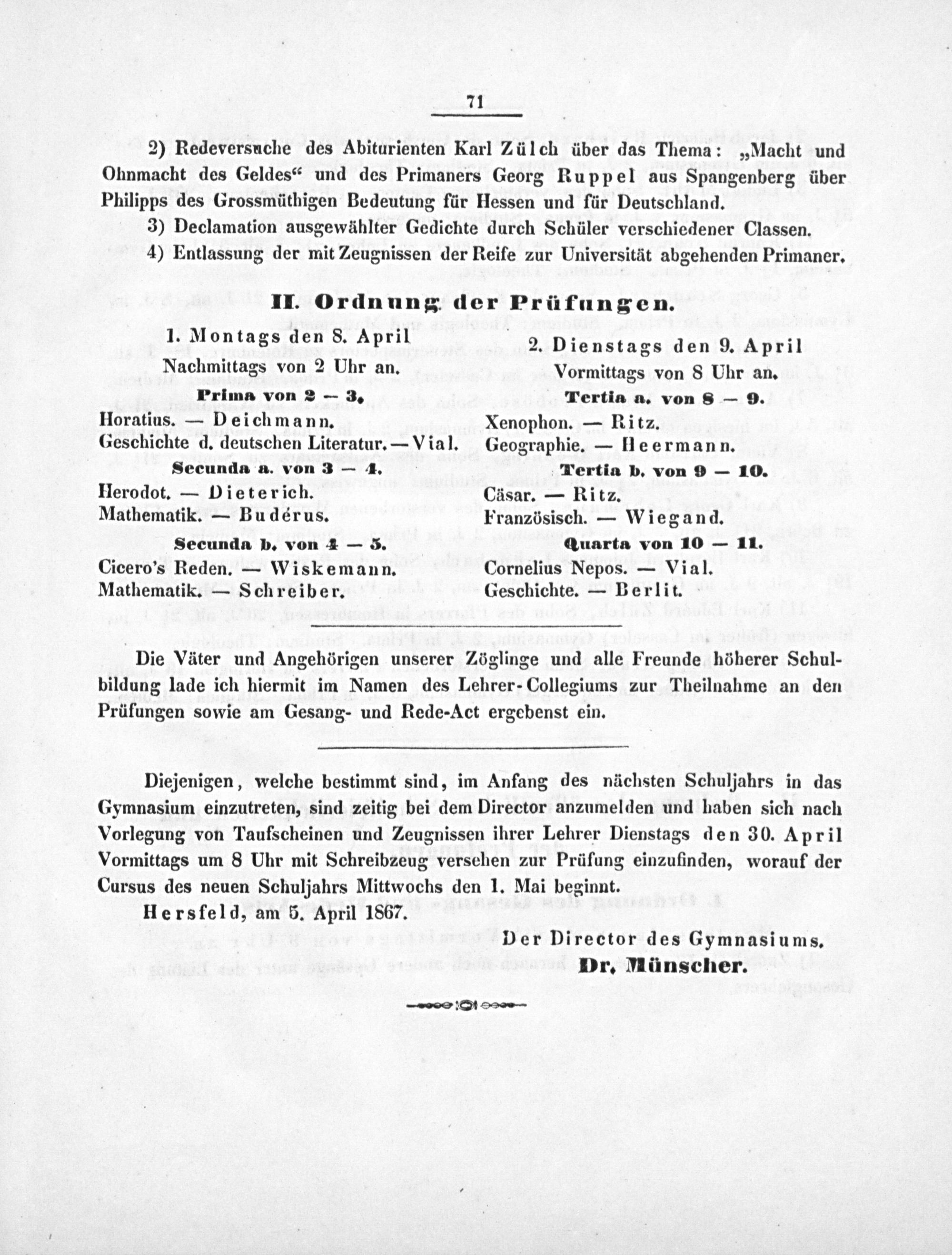 2) Redeversuche des Abiturienten Karl Zülch über das Thema:„Macht und Ohnmacht des Geldes“ und des Primaners Georg Ruppel aus Spangenberg über Philipps des Grossmüthigen Bedeutung für Hessen und für Deutschland.