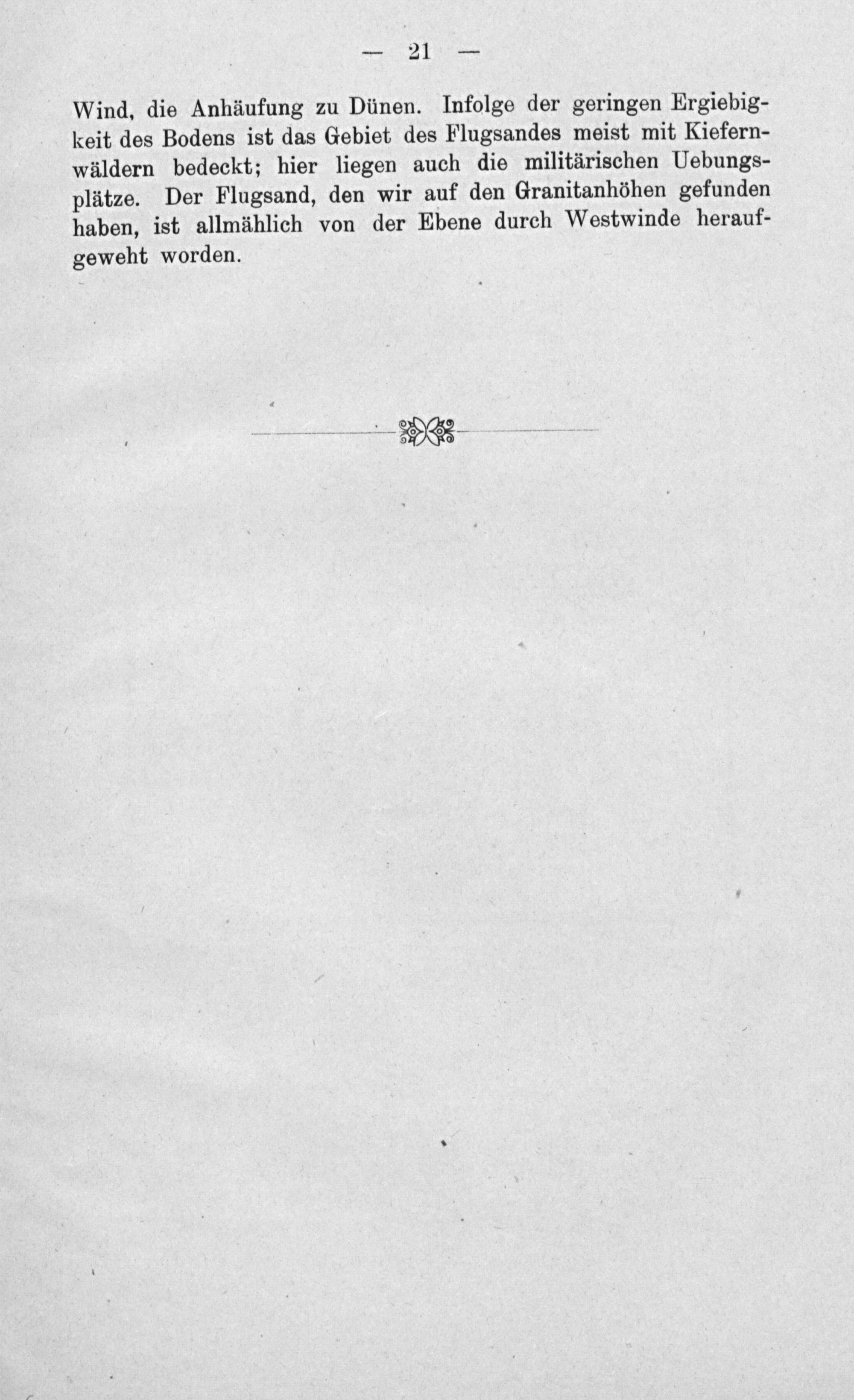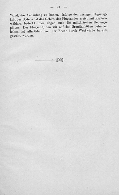 Wind, die Anhäufung zu Dünen. Infolge der geringen Ergiebig- keit des Bodens ist das Gebiet des Flugsandes meist mit Kiefern- wäldern bedeckt; hier liegen auch die militärischen Uebungs- plätze. Der Flugsand, den wir auf den Granitanhöhen gefunden haben, ist allmählich von der Ebene durch Westwinde herauf-
