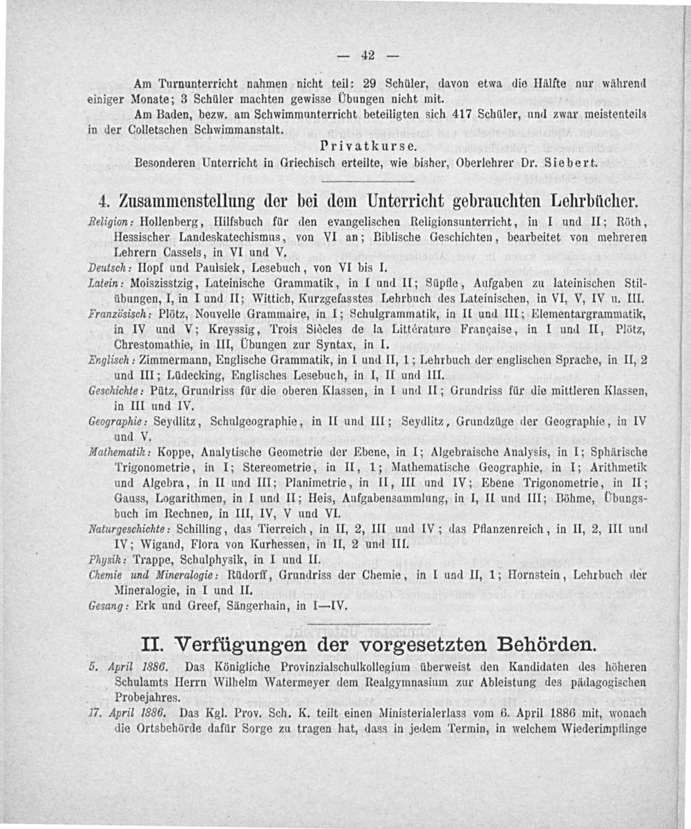 Mathematin: Koppe, Analytische Geometrie der Ebene, in I; Algebraische Analysis, in I; Sphärische Trigonometrie, in I; Stereometrie, in II, 1; Mathematische Geographie, in I; Arithmetik und Algebra, in II und III; Planimetrie, in II, III und IV; Ebene Trigonometrie, in II; Gauss, Logarithmen, in I und II; Heis, Aufgabensammlaung, in I, Il und III; Böhme, UÜbungs- buch im Rechnen, in III, IV, V und VI.
