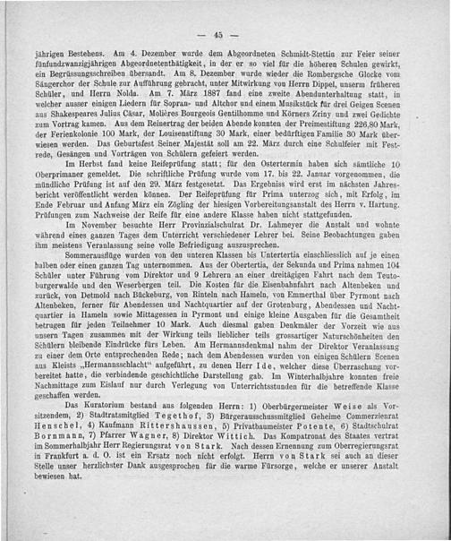 jährigen Bestehens. Am 4. Dezember wurde dem Abgeordneten Schmidt-Stettin zur Feier seiner fünfundzwanzigjährigen Abgeordnetenthätigkeit, in der er so viel für die höheren Schulen gewirkt, ein Begrüssungsschreiben übersandt. Am 8. Dezember wurde wieder die Rombergsche Glocke vom Sängerchor der Schule zur Aufführung gebracht, unter Mitwirkung von Herrn Dippel, unserm früheren Schüler, und Herrn Nolda. Am 7. März 1887 fand eine zweite Abendunterhaltung statt, in welcher ausser einigen Liedern für Sopran- und Altchor und einem Musikstück für drei Geigen Scenen aus Shakespeares Julius Cäsar, Molières Bourgeois Gentilhomme und Körners Zriny und zwei Gedichte zum Vortrag kamen. Aus dem Reinertrag der beiden Abende konnten der Preimestiftung 226,80 Mark, der Ferienkolonie 100 Mark, der Louisenstiftung 30 Mark, einer bedürftigen Familie 30 Mark über- wiesen werden. Das Geburtsfest Seiner Majestät soll am 22. März durch eine Schulfeier mit Fest- rede, Gesängen und Vorträgen von Schülern gefeiert werden.