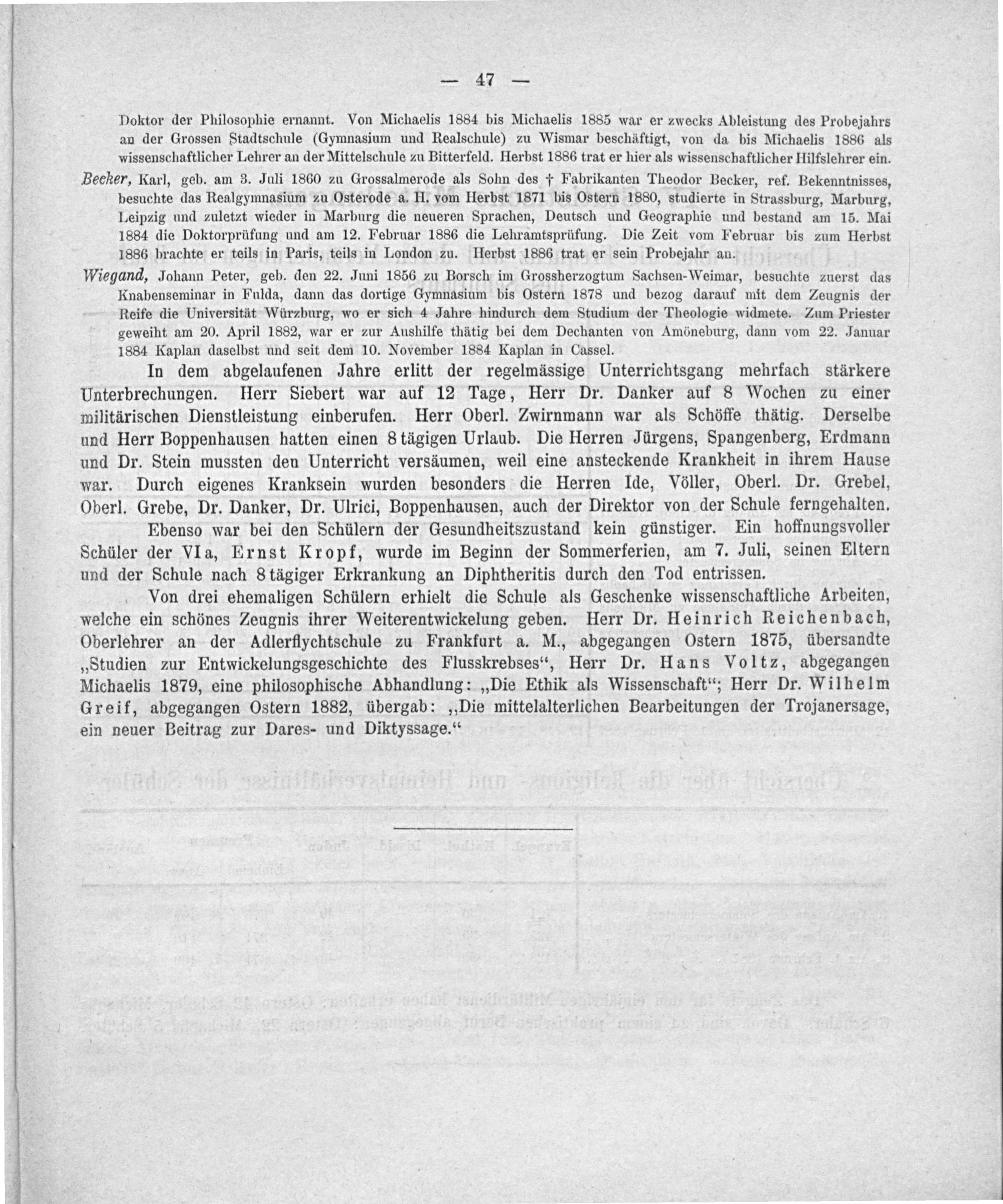 Doktor der Philosophie ernannt. Von Michaelis 1884 bis Michaelis 1885 war er zwecks Ableistung des Probejahrs an der Grossen Stadtschule(Gymnasium und Realschule) zu Wismar beschäftigt, von da bis Michaelis 1886 als wissenschaftlicher Lehrer an der Mittelschule zu Bitterfeld. Herbst 1886 trat er hier als wissenschaftlicher Hilfslehrer ein.