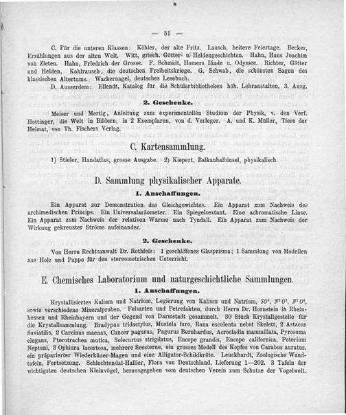 Von Herrn Rechtsanwalt Dr. Rothfels: 1 geschliffenes Glasprisma; 1 Sammlung von Modellen aus Holz und Pappe für den stereometrischen Unterricht.