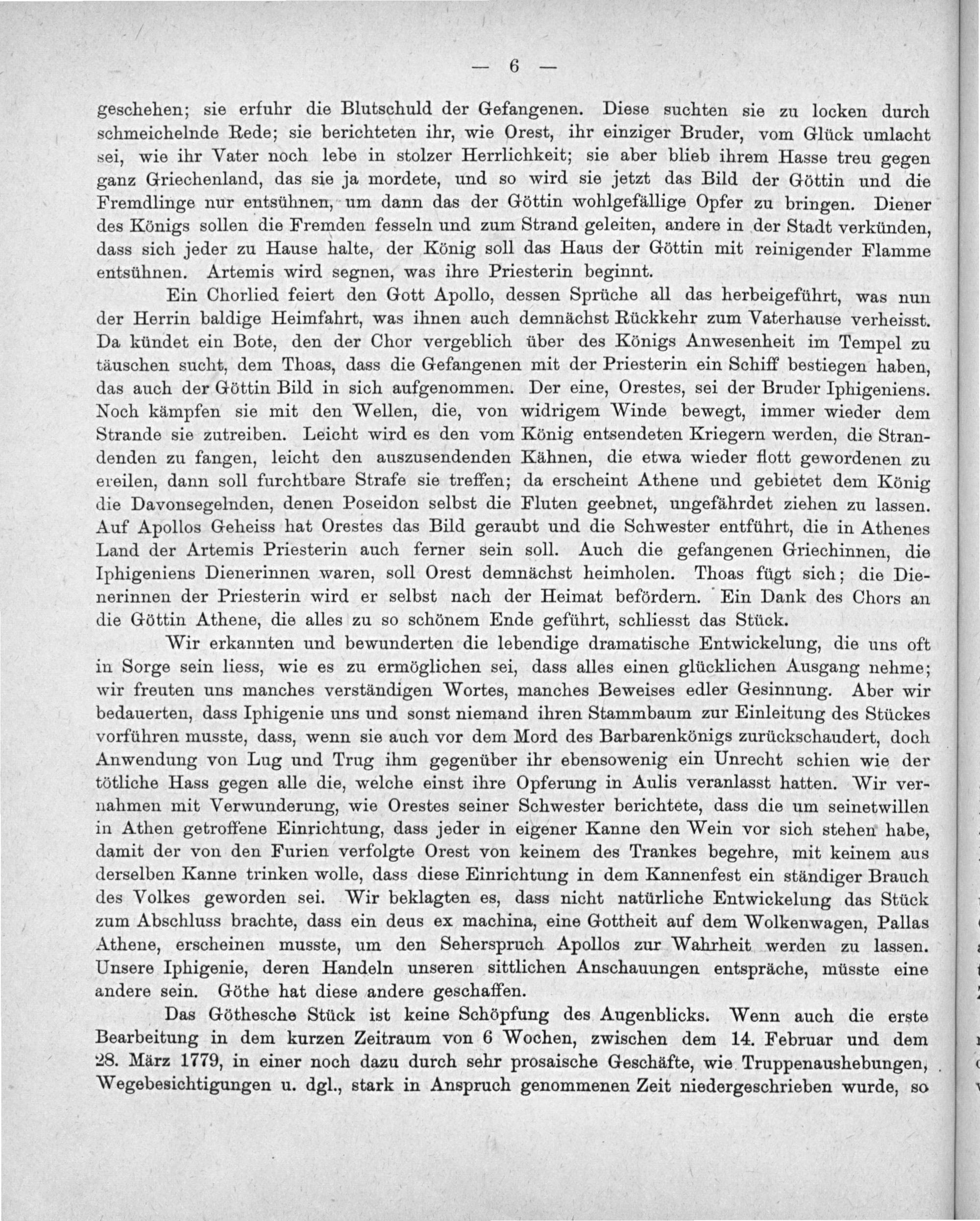 Wir erkannten und bewunderten die lebendige dramatische Entwickelung, die uns oft in Sorge sein liess, wie es zu ermöglichen sei, dass alles einen glücklichen Ausgang nehme; wir freuten uns manches verständigen Wortes, manches Beweises edler Gesinnung. Aber wir bedauerten, dass Iphigenie uns und sonst niemand ihren Stammbaum zur Einleitung des Stückes vorführen musste, dass, wenn sie auch vor dem Mord des Barbarenkönigs zurückschaudert, doch Anwendung von Lug und Trug ihm gegenüber ihr ebensowenig ein Unrecht schien wie der tötliche Hass gegen alle die, welche einst ihre Opferung in Aulis veranlasst hatten. Wir ver- nahmen mit Verwunderung, wie Orestes seiner Schwester berichtete, dass die um seinetwillen in Athen getroffene Einrichtung, dass jeder in eigener Kanne den Wein vor sich stehen habe, damit der von den Furien verfolgte Orest von keinem des Trankes begehre, mit keinem aus derselben Kanne trinken wolle, dass diese Einrichtung in dem Kannenfest ein ständiger Brauch des Volkes geworden sei. Wir beklagten es, dass nicht natürliche Entwickelung das Stück zum Abschluss brachte, dass ein deus ex machina, eine Gottheit auf dem Wolkenwagen, Pallas Athene, erscheinen musste, um den Seherspruch Apollos zur Wahrheit werden zu lassen. Unsere Iphigenie, deren Handeln unseren sittlichen Anschauungen entspräche, müsste eine andere sein. Göthe hat diese andere geschaffen.