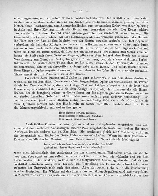 Auch Göthes Orestes und sein Pylades sind weit eingehender ausgeführte und ent- sprechend den sittlichen Auffassungen unserer Zeit umgebildete Gestalten. Schon ihr erstes Auftreten ist ein anderes als bei Euripides. Sie erscheinen gleich als Gefangene, nicht um die Gelegenheit zum Raube des Götterbildes auszukundschaften. Wenn bei dem griechischen Dichter allenfalls die bei Orestes in dieser Scene einmal zu Tage tretende Mutlosigkeit: