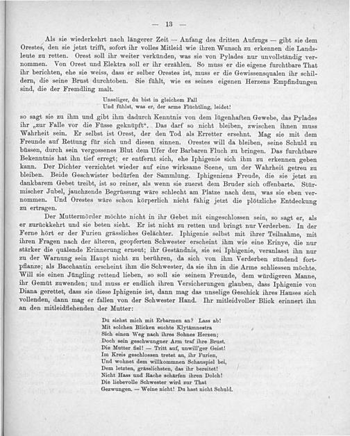 Der Muttermörder möchte nicht in ihr Gebet mit eingeschlossen sein, so sagt er, als er zurückkehrt und sie beten sieht. Er ist nicht zu retten und bringt nur Verderben. In der Ferne hört er der Furien grässliches Gelächter. Iphigenie selbst mit ihrer Teilnahme, mit ihren Fragen nach der älteren, geopferten Schwester erscheint ihm wie eine Erinye, die nur stärker die quälende Erinnerung erneut; ihr Geständnis, sie sei Iphigenie, veranlasst ihn nur zu der Warnung sein Haupt nicht zu berühren, da sich von ihm Verderben zündend fort- pflanze; als Bacchantin erscheint ihm die Schwester, da sie ihn in die Arme schliessen möchte. Will sie einen Jüngling rettend lieben, so soll sie seinem Freunde, dem würdigeren Manne, ihr Gemüt zuwenden; und muss er endlich ihren Versicherungen glanben, dass Iphigenie von Diana gerettet, dass sie diese Iphigenie ist, dann mag das unselige Geschick ihres Hauses sich vollenden, dann mag er fallen von der Schwester Hand. Ihr mitleidvoller Blick erinnert ihn an den mitleidſlehenden der Mutter: