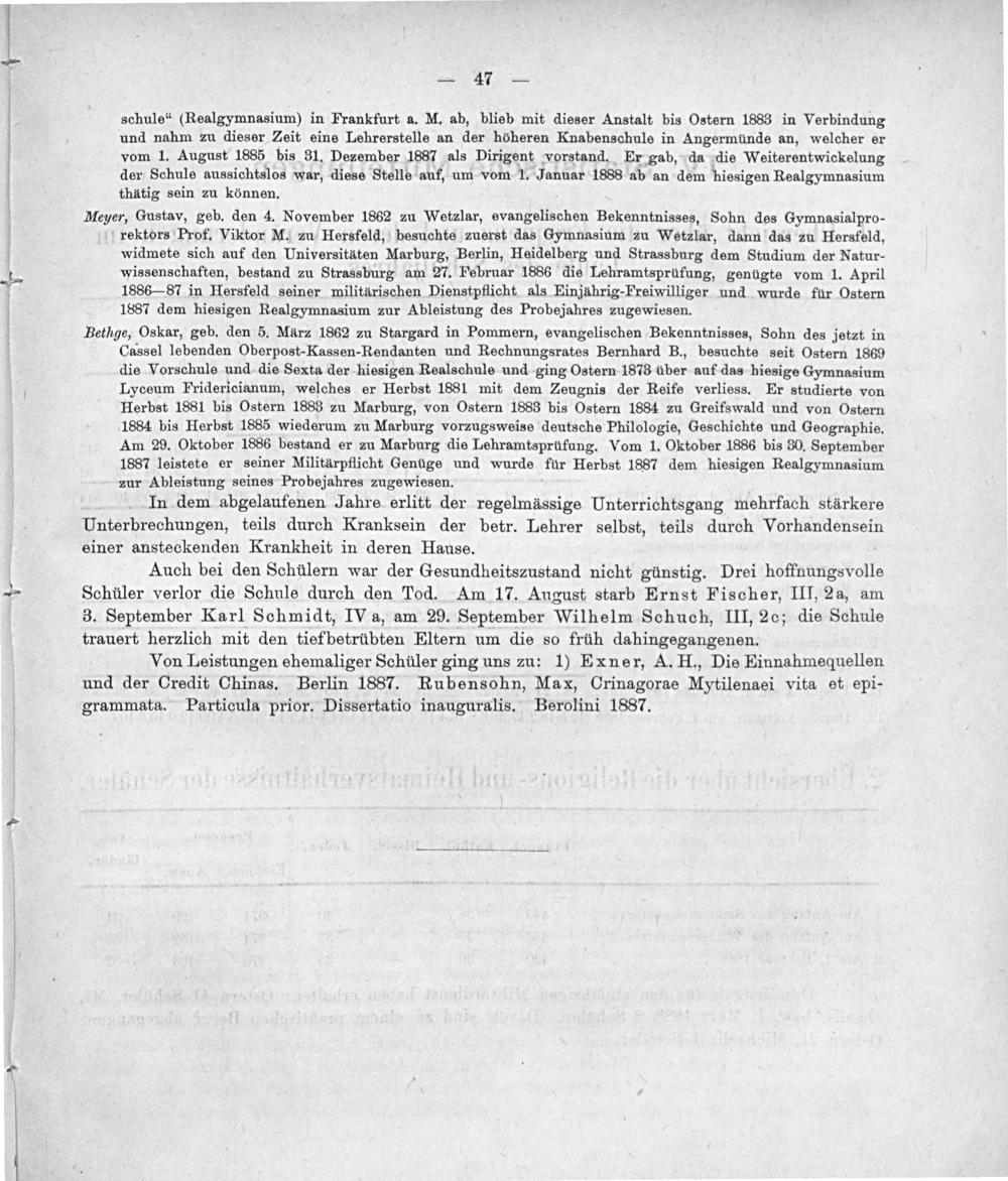 wissenschaften, bestand zu Strassburg am 27. Februar 1886 die Lehramtsprüfung, genügte vom 1. April 1886—87 in Hersfeld seiner militärischen Dienstpflicht als Einjährig-Freiwilliger und wurde für Ostern 1887 dem hiesigen Realgymnasium zur Ableistung des Probejahres zugewiesen.
