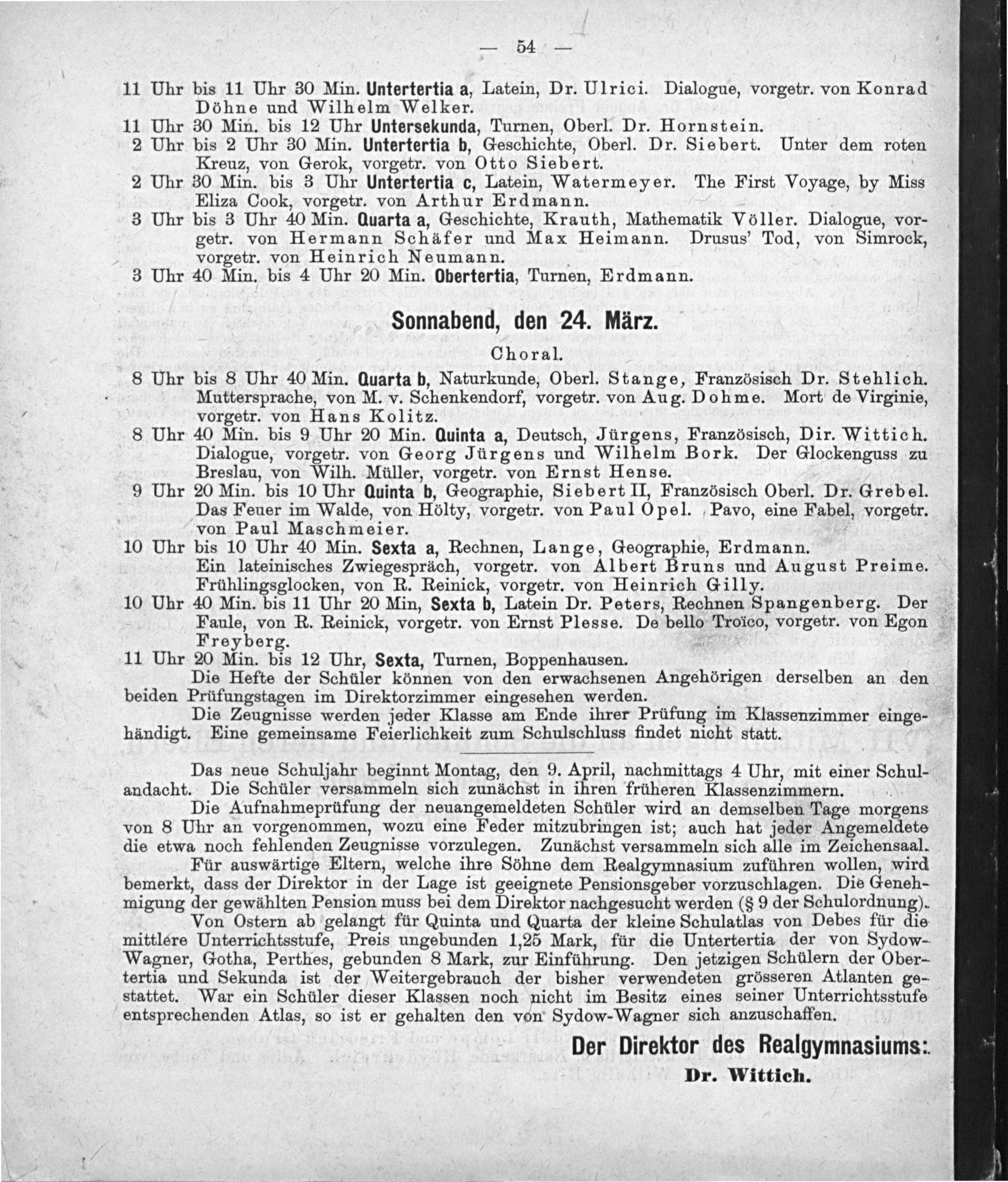 11 Uhr bis 11 Uhr 30 Min. Untertertia a, Latein, Dr. Ulrici. Dialogue, vorgetr. von Konrad Döhne und Wilhelm Welker. 11 Uhr 30 Min. bis 12 Uhr Untersekunda, Turnen, Oberl. Dr. Hornstein.
