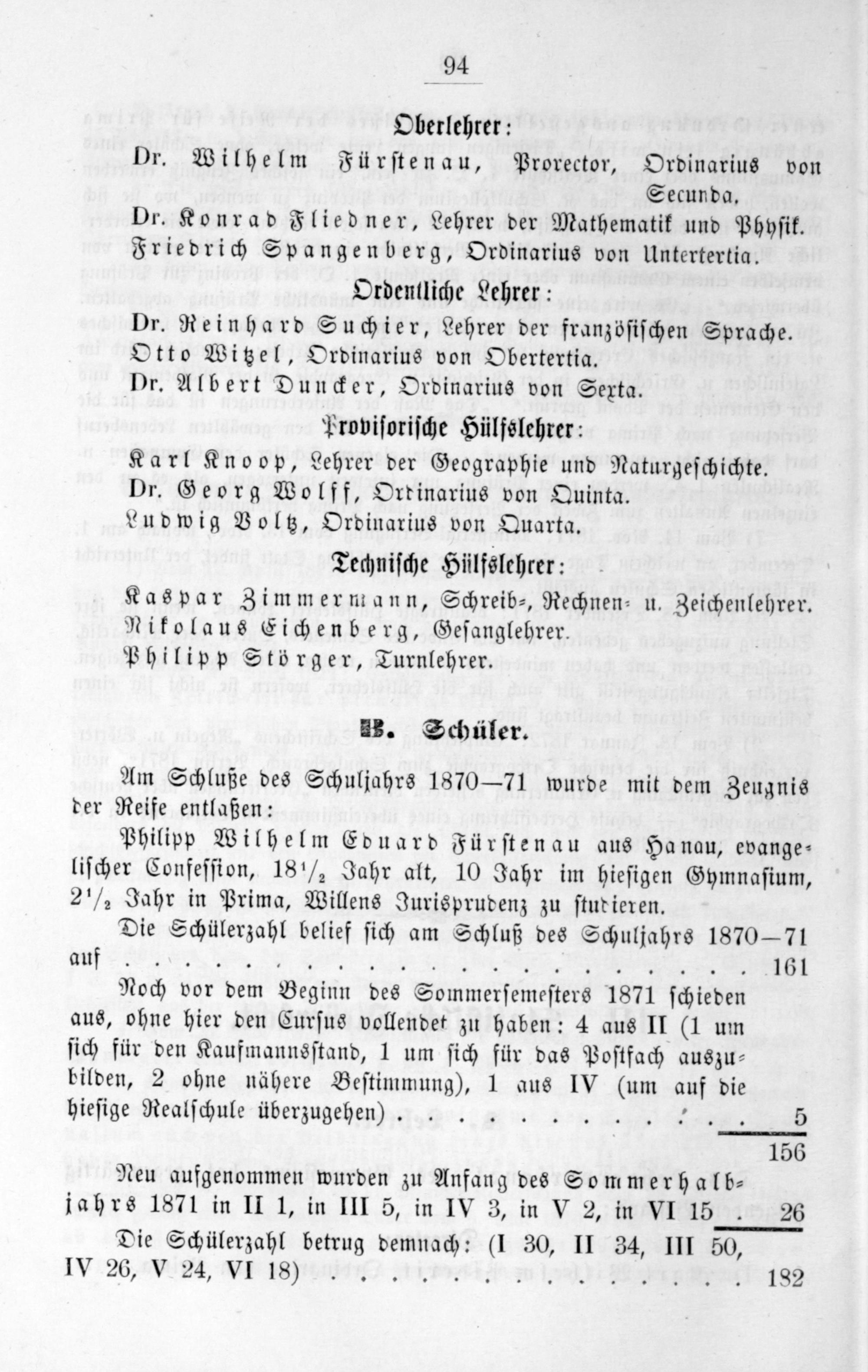 94 Oberlehrer: Dr. Wilhelm Fürſtenau, Prorector, Ordinarius von Secunda. Dr. Konrad Fliedner, Lehrer der Mathematik und Phyſik. Friedrich Spangenberg, Ordinarius von Untertertia.