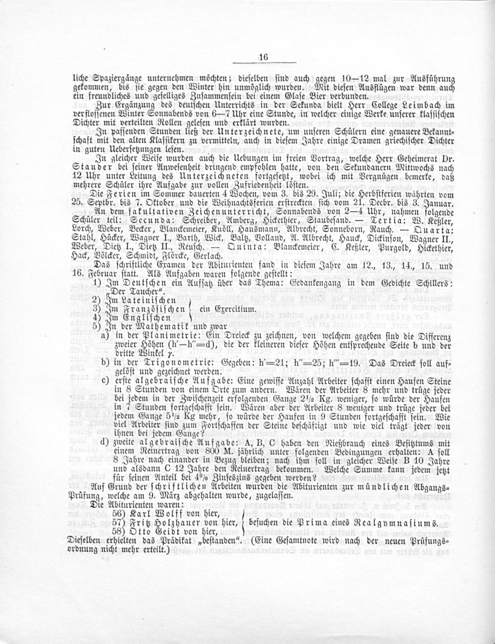 Das ſchriftliche Examen der Abiturienten fand in dieſem Jahre am 12., 13., 14., 15. und 16. Februar ſtatt. Als Aufgaben waren folgende geſtellt: