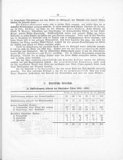 1) Schülerfrequenz während des Schuljahres Oſtern 1882— 1883. Vl. Cl. V. Cl. IV. Cl.] III. Cl. II. Cl. Summa. Schülerfrequenz während des Sommerſemeſters... 38 30 56 39 32 195