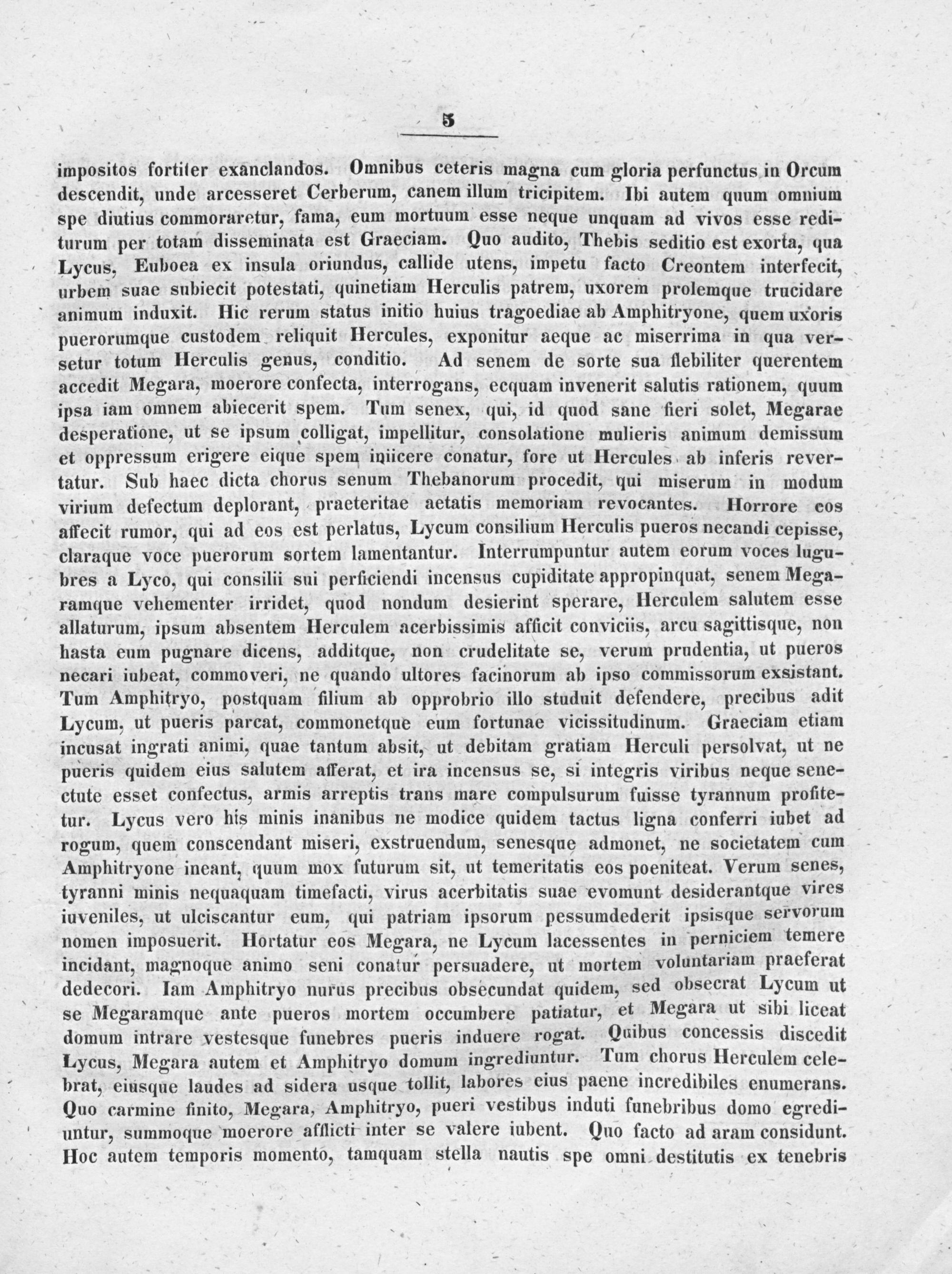impositos fortiter exanclandos. Omnibus ceteris magna cum gloria perfunctus in Orcum descendit, unde arcesseret Cerberum, canem illum tricipitem. Ibi autem quum omnium spe diutius commoruretur, fama, eum mortuum esse neque unquam ad vivos esse redi- turum per totam disseminata est Graeciam. Quo audito, Thebis seditio est exorta, qua Lycus, Euboea ex insula oriundus, callide utens, impetu facto Creontem interfecit, urbem suae subiecit potestati, quinetiam Herculis patrem, uxorem prolemque trucidare animum induxit. Hic rerum status initio huius tragoediae ab Amphitryone, quem uxoris puerorumque custodem reliquit Hercules, exponitur aeque ac miserrima in qua ver- setur totum Herculis genus, conditio. Ad senem de sorte sua flebiliter querentem accedit Megara, moerore confecta, interrogans, ecquam invenerit salutis rationem, quum ipsa iam omnem abiecerit spem. Tum senex, qui, id quod sane fieri solet, Megarae desperatione, ut se ipsum colligat, impellitur, consolatione mulieris animum demissum et oppressum erigere eique spem iniicere conatur, fore ut Hercules ab inferis rever- tatur. Sub haec dicta chorus senum Thebanorum procedit, qui miserum in modum virium defectum deplorant, praeteritae aetatis memoriam revocantes. Horrore cos affecit rumor, qui ad eos est perlatus, Lycum consilium Herculis pueros necandi cepisse, claraque voce puerorum sortem lamentantur. Interrumpuntur autem eorum voces lugu- bres a Lyco, qui consilii sui perficiendi incensus cupiditate appropinquat, senem Mega- ramque vehementer irridet, quod nondum desierint sperare, Herculem salutem esse allaturum, ipsum absentem Herculem acerbissimis afficit conviciis, arcu sagittisque, non hasta eum pugnare dicens, additque, non crudelitate se, verum prudentia, ut pueros necari iubeat, commoveri, ne quando ultores facinorum ab ipso commissorum exsistant. Tum Amphitryo, postquam fllium ab opprobrio illo studuit defendere, precibus adit Lycum, ut pueris parcat, commonetque eum fortunae vicissitudinum. Graeciam etiam incusat ingrati animi, quae tantum absit, ut debitam gratiam Herculi persolvat, ut ne pueris quidem eius salutem afferat, et ira incensus se, si integris viribus neque sene- ctute esset confectus, armis arreptis trans mare compulsurum fuisse tyrannum profite- tur. Lycus vero his minis inanibus ne modice quidem tactus ligna conferri iubet ad rogum, quem conscendant miseri, exstruendum, senesque admonet, ne societatem cum Amphitryone ineant, duum mox futurum sit, ut temeritatis eos poeniteat. Verum senes, tyranni minis nequaquam timefacti, virus acerbitatis suae evomunt desiderantque vires iuveniles, ut ulciscantur eum, qui patriam ipsorum pessumdederit ipsisque servorum nomen imposuerit. Hortatur eos Megara, ne Lycum lacessentes in perniciem temere incidant, magnoque animo seni conatur persuadere, ut mortem voluntariam praeferat dedecori. Iam Amphitryo nurus precibus obsecundat quidem, sed obsecrat Lycum ut se Megaramque ante pueros mortem occumbere patiatur, et Megara ut sibi liceat domum intrare vestesque funebres pueris induere rogat. Quibus concessis discedit Lycus, Megara autem et Amphitryo domum ingrediuntur. Tum chorus Herculem cele- brat, ciusque laudes ad sidera usque tollit, labores cius paene incredibiles enumerans. Quo carmine finito, Megara, Amphitryo, pueri vestibus induti funebribus domo egredi- untur, summoque moerore afflicti inter se valere iubent. Quo facto ad aram considunt. Hoc autem temporis momento, tamquam stella nautis spe omni destitutis ex tenebris