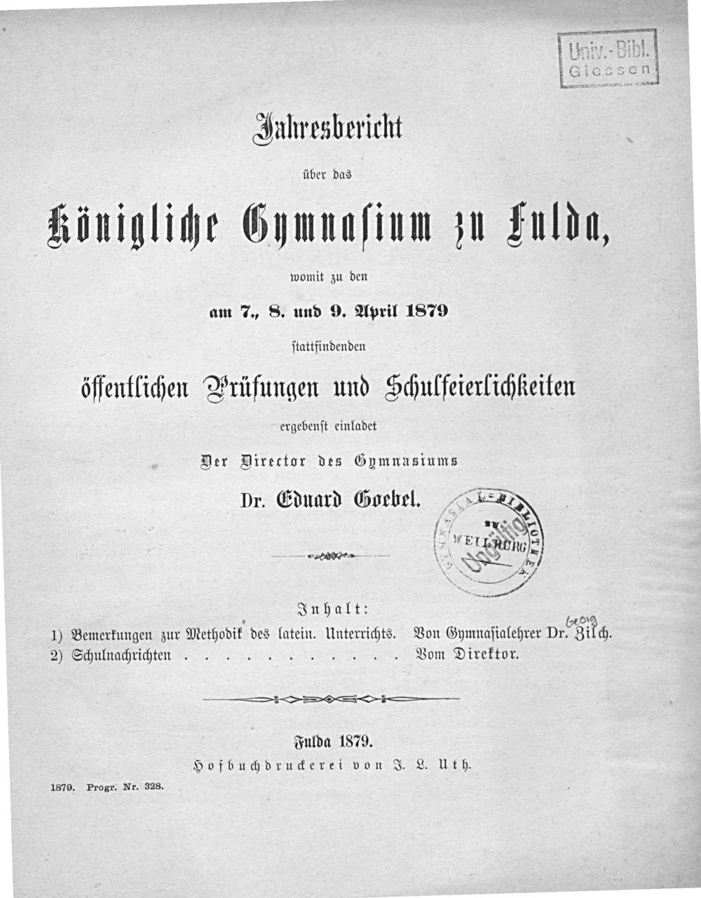 Fulda 1879. Hofbuchdruckerei von J. L. Uth.
