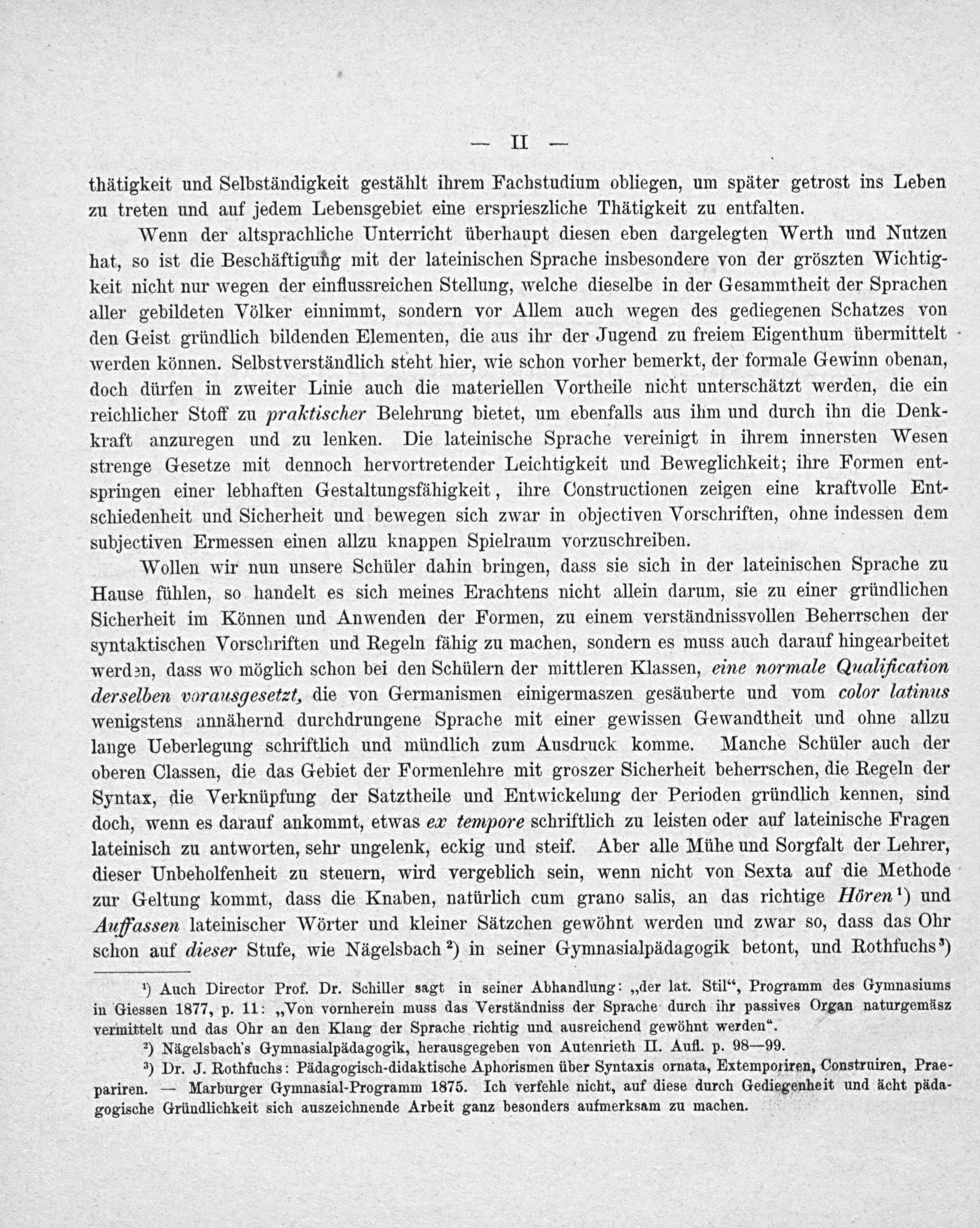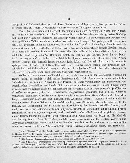 Wollen wir nun unsere Schüler dahin bringen, dass sie sich in der lateinischen Sprache zu Hause fühlen, so handelt es sich meines Erachtens nicht allein darum, sie zu einer gründlichen Sicherheit im Können und Anwenden der Formen, zu einem verständnissvollen Beherrschen der syntaktischen Vorschriften und Regeln fähig zu machen, sondern es muss auch darauf hingearbeitet werden, dass wo möglich schon bei den Schülern der mittleren Klassen, eine normale Qualification derselben vorausgesetet, die von Germanismen einigermaszen gesäuberte und vom color latinus wenigstens annähernd durchdrungene Sprache mit einer gewissen Gewandtheit und ohne allzu lange Ueberlegung schriftlich und mündlich zum Ausdruck komme. Manche Schüler auch der oberen Classen, die das Gebiet der Formenlehre mit groszer Sicherheit beherrschen, die Regeln der Syntax, die Verknüpfung der Satztheile und Entwickelung der Perioden gründlich kennen, sind doch, wenn es darauf ankommt, etwas ex tempore schriftlich zu leisten oder auf lateinische Fragen lateinisch zu antworten, sehr ungelenk, eckig und steif. Aber alle Mühe und Sorgfalt der Lehrer, dieser Unbeholfenheit zu steuern, wird vergeblich sein, wenn nicht von Sexta auf die Methode zur Geltung kommt, dass die Knaben, natürlich cum grano salis, an das richtige Hören ¹) und Auffassen lateinischer Wörter und kleiner Sätzchen gewöhnt werden und zwar so, dass das Ohr schon auf dieser Stufe, wie Nägelsbach ²) in seiner Gymnasialpädagogik betont, und Rothfuchs ³)