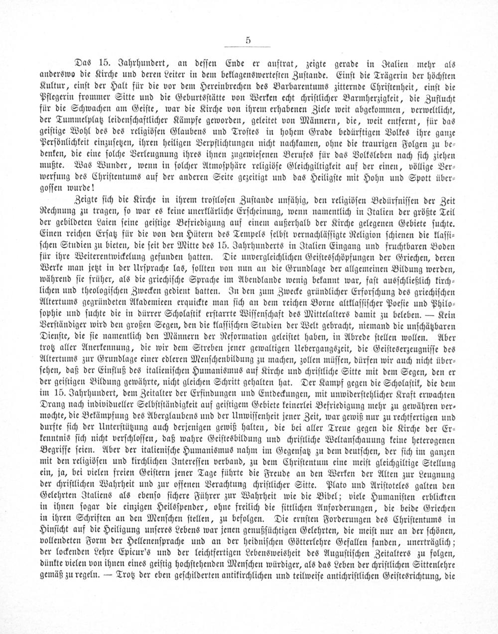 Das 15. Jahrhundert, an deſſen Ende er auftrat, zeigte gerade in Italien mehr als anderswo die Kirche und deren Leiter in dem beklagenswerteſten Zuſtande. Einſt die Trägerin der höchſten Kultur, einſt der Halt für die vor dem Hereinbrechen des Barbarentums zitternde Chriſtenheit, einſt die Pflegerin frommer Sitte und die Geburtsſtätte von Werken echt chriſtlicher Barmherzigkeit, die Zuflucht für die Schwachen am Geiſte, war die Kirche von ihrem erhabenen Ziele weit abgekommen, verweltlicht, der Tummelplatz leidenſchaftlicher Kämpfe geworden, geleitet von Männern, die, weit entfernt, für das geiſtige Wohl des des religiöſen Glaubens und Troſtes in hohem Grade bedürftigen Volkes ihre ganze Perſönlichkeit einzuſetzen, ihren heiligen Verpflichtungen nicht nachkamen, ohne die traurigen Folgen zu be⸗ denken, die eine ſolche Verleugnung ihres ihnen zugewieſenen Berufes für das Volksleben nach ſich ziehen mußte. Was Wunder, wenn in ſolcher Atmoſphäre religiöſe Gleichgiltigkeit auf der einen, völlige Ver⸗ werfung des Chriſtentums auf der anderen Seite gezeitigt und das Heiligſte mit Hohn und Spott über⸗ goſſen wurde!