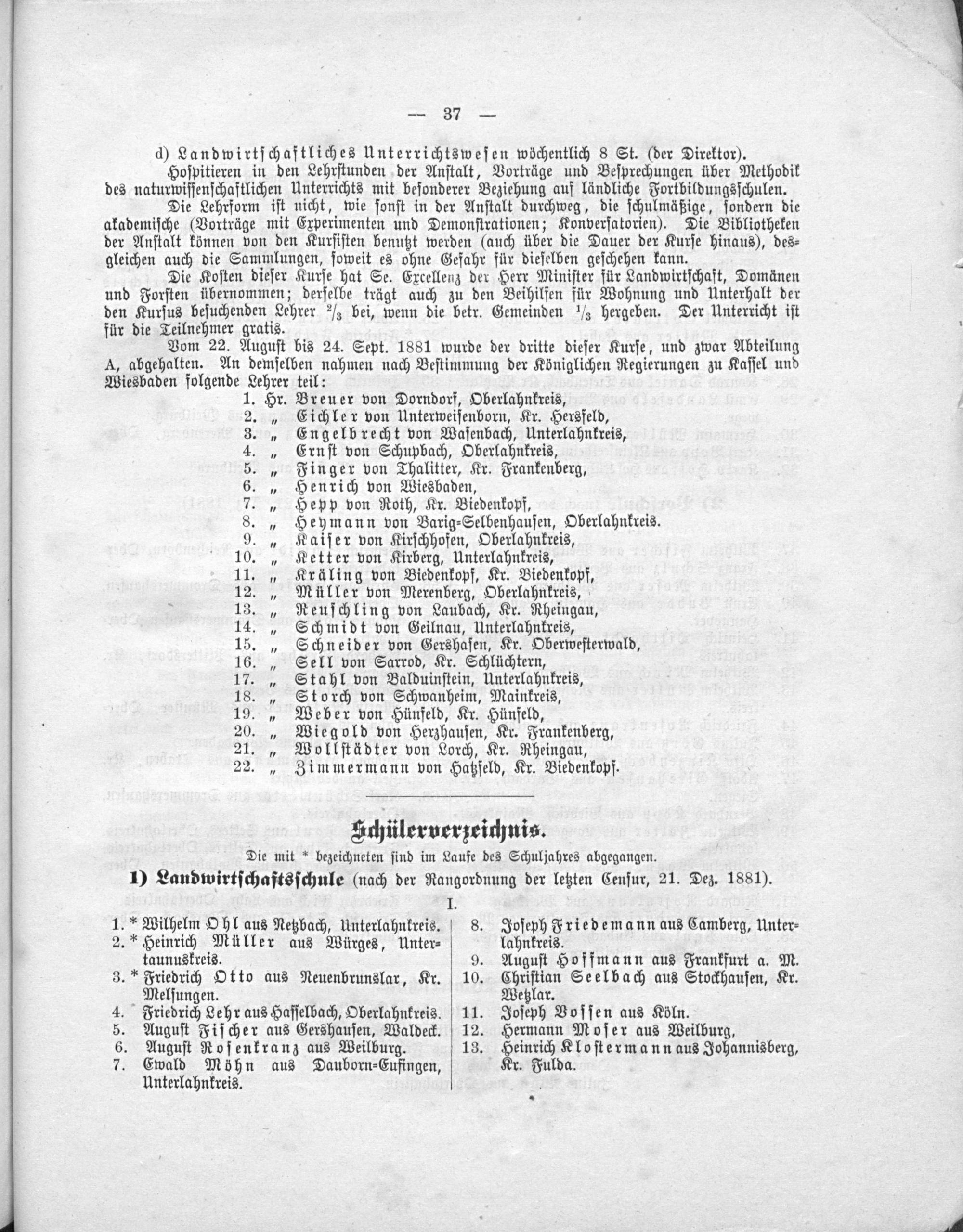Vom 22. Auguſt bis 24. Sept. 1881 wurde der dritte dieſer Kurſe, und zwar Abteilung A, abgehalten. An demſelben nahmen nach Beſtimmung der Königlichen Regierungen zu Kaſſel und Wiesbaden folgende Lehrer teil: