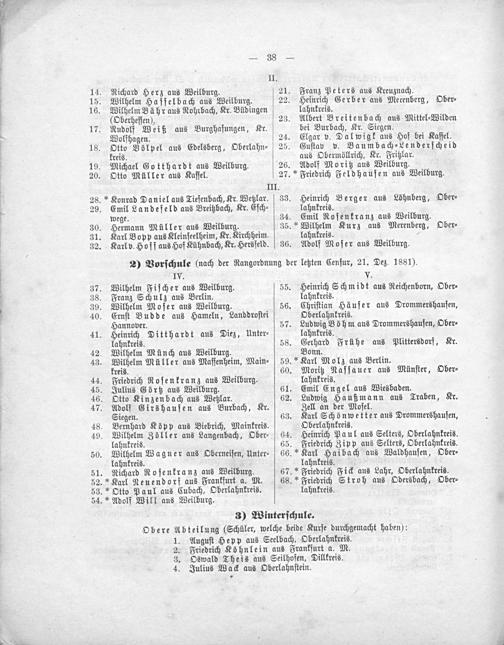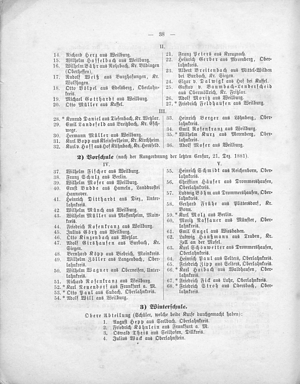 IV. V. Wilhelm Fiſcher aus Weilburg. 55. Heinrich Schmidt aus Reichenborn, Ober⸗ Franz Schulz aus Berlin. lahnkreis. Wilhelm Moſer aus Weilburg. 56. Chriſtian Häuſer aus Drommershauſen, Ernſt Budde aus Hameln, Landdroſtei Oberlahnkreis. Hannover. 57. Ludwig Böhm aus Drommershauſen, Ober⸗ Heinrich Ditthardt aus Diez, Unter⸗ lahnkreis. lahnkreis. 58. Gerhard Frühe aus Plittersdorf, Kr. Wilhelm Münch aus Weilburg. Bonn. Wilhelm Müller aus Maſſenheim, Main⸗ 59.* Karl Molz aus Berlin. kreis. 60. Moritz Naſſauer aus Münſter, Ober⸗ Friedrich Roſenkranz aus Weilburg. lahnkreis. Julius Görtz aus Weilburg. 61. Emil Engel aus Wiesbaden. Otto Kinzenbach aus Wetzar. 62. Ludwig Haußmann aus Traben, Kr. Adolf Girshauſen aus Burbach, Kr. Zell an der Moſel. Siegen. 63. Karl Schönwetter aus Drommershauſen, Bernhard Köpp aus Biebrich, Mainkreis. Oberlahnkreis. Wilhelm Zöller aus Langenbach, Ober⸗ 64. Heinrich Paul aus Selters, Oberlahnkreis. lahnkreis. 65. Friedrich Zipp aus Selters, Oberlahnkreis. Wilhelm Wagner aus Oberneiſen, Unter⸗ 66.* Karl Haibach aus Waldhauſen, Ober⸗ lahnkreis. lahnkreis. Richard Roſenkranz aus Weilburg. 67.* Friedrich Fick aus Lahr, Oberlahnkreis. Karl Neuendorf aus Frankfurt a. M. 68.* Friedrich Stroh aus Odersbach, Ober⸗ Otto Paul aus Cubach, Oberlahnkreis. lahnkreis. Adolf Will aus Weilburg.
