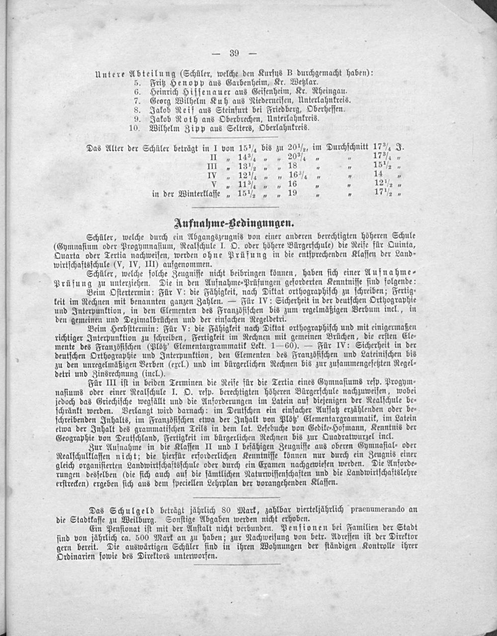 Das Schulgeld beträgt jährlich 80 Mark, zahlbar vierteljährlich praenumerando an die Stadtkaſſe zu Weilburg. Sonſtige Abgaben werden nicht erhoben.
