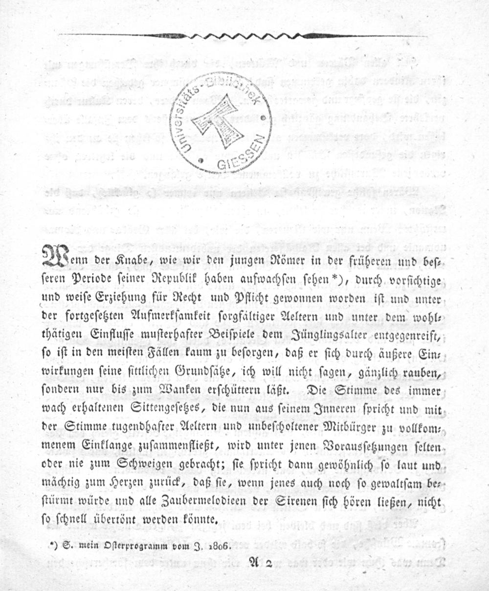 MWenn der Knabe, wie wir den jungen Römer in der früheren und beſ⸗⸗ ſeren Periode ſeiner Republik baben aufwachſen ſehen*), durch vorſichtige und weiſe Erziehung für Recht und Pflicht gewonnen worden iſt und unter der fortgeſetzten Aufmerkſamkeit ſorgfäͤltiger Aeltern und unter dem wohl⸗ thätigen Einfluſſe muſterhafter Beiſpiele dem Jünglingsalter entgegenreift, ſo iſt in den meiſten Fällen kaum zu beſorgen, daß er ſich durch äußere Ein⸗ wirkungen ſeine ſittlichen Grundſätze, ich will nicht ſagen, gänzlich rauben, ſondern nur bis zum Wanken erſchüttern läßt. Die Stimme des immer wach erhaltenen Sittengeſetzes, die nun aus ſeinem Inneren ſpricht und mit. der Stimme tugendhafter Aeltern und unbeſcholtener Mitbürger zu vollkom⸗ menem Einklange zuſammenfließt, wird unter jenen Vorausſetzungen ſelten. oder nie zum Schweigen gebracht; ſie ſpricht dann gewöhnlich ſo laut und mächtig zum Herzen zurück, daß ſie, wenn jenes auch noch ſo gewaltſam be⸗ ſtürmt würde und alle Zaubermelodieen der Sirenen ſich hören ließen, nicht ſo ſchnell übertönt werden könnte.