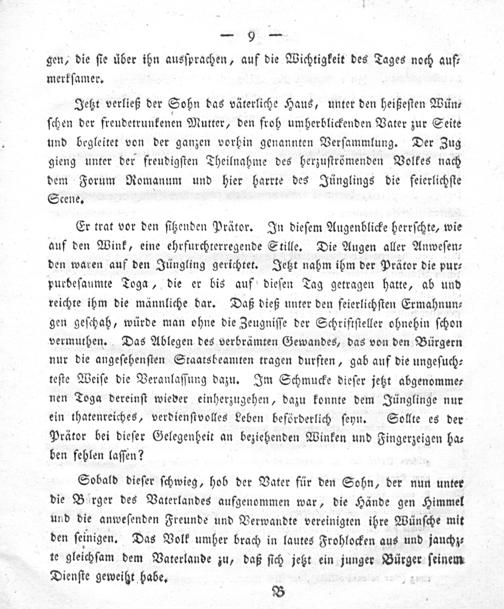 Er trat vor den ſitzenden Prätor. In dieſem Augenblicke herrſchte, wie auf den Wink, eine ehrfurchterregende Stille. Die Augen aller Anweſen— den waren auf den Jüngling gerichtet. Jetzt nahm ihm der Prätor die pur⸗ purbeſaumte Toga, die er bis auf dieſen Tag getragen hatte, ab und reichte ihm die männliche dar. Daß dieß unter den ſeierlichſten Ermahnun⸗ gen geſchah, würde man ohne die Zeugniſſe der Schriftſteller ohnehin ſchon vermuthen. Das Ablegen des verbrämten Gewandes, das von den Bürgern nur die angeſehenſten Staatsbeamten tragen durften, gab auf die ungeſuch⸗ teſte Weiſe die Veranlaſſung dazu. Im Schmucke dieſer jetzt abgenomme⸗ nen Toga dereinſt wieder einherzugehen, dazu konnte dem Jünglinge nur ein thatenreiches, verdienſtvolles Leben beförderlich ſeyn. Sollte es der Prätor bei dieſer Gelegenheit an beziehenden Winken und Fingerzeigen ha⸗ ben fehlen laſſen?