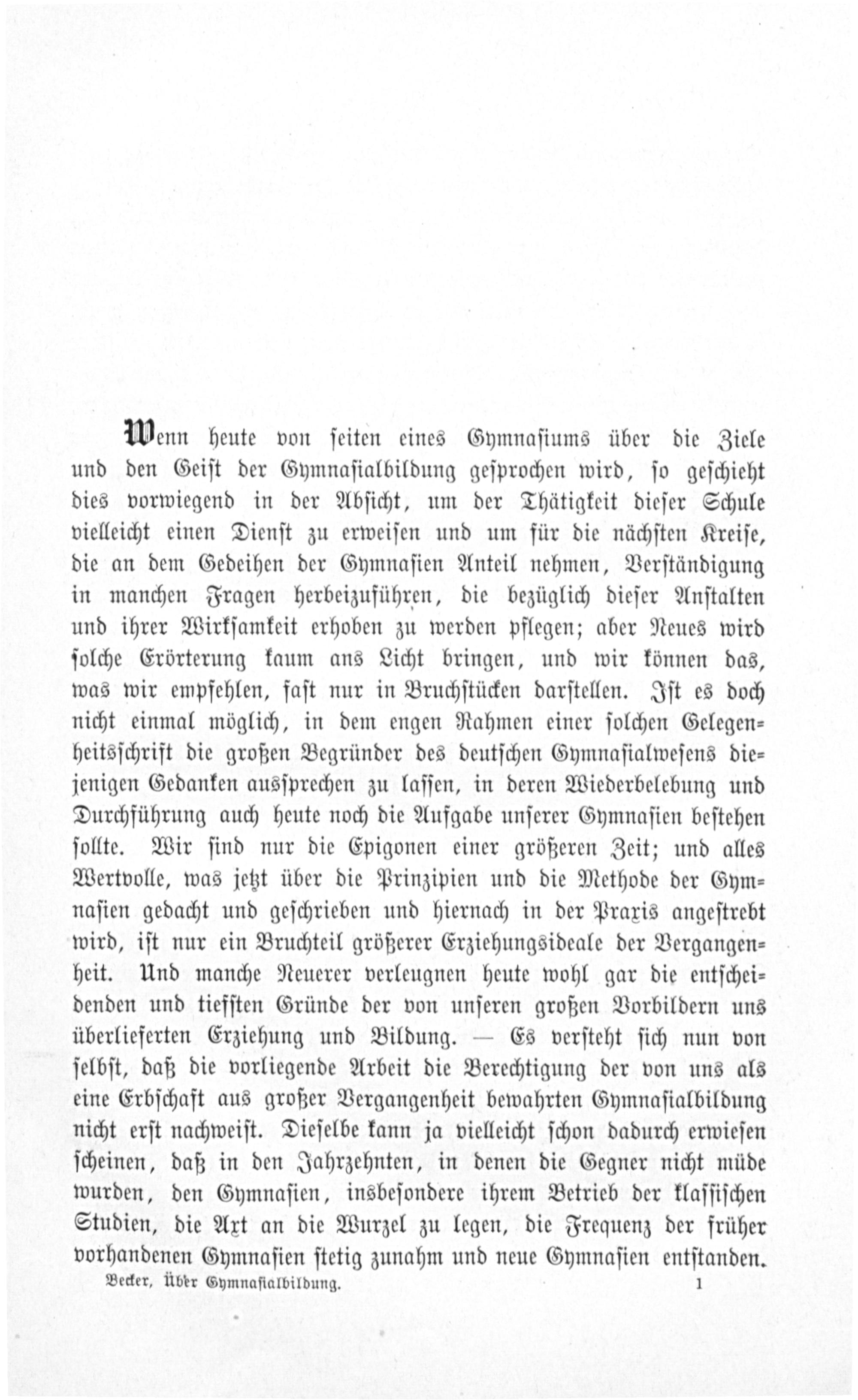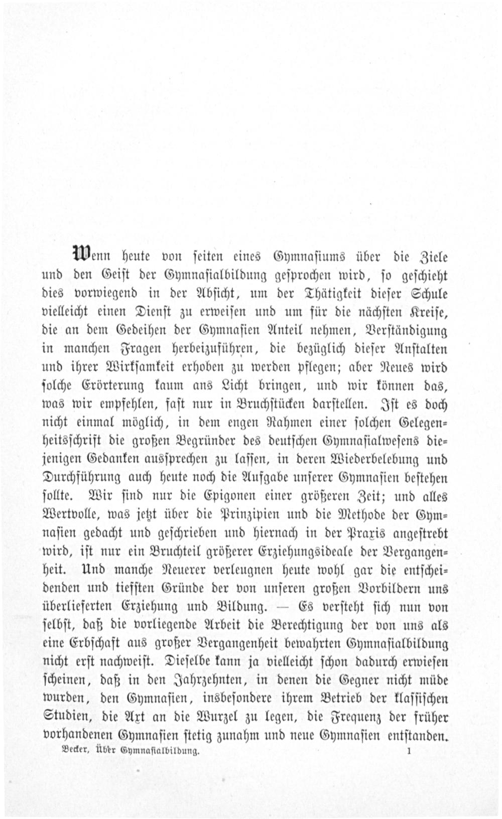 Wenn heute von ſeiten eines Gymnaſiums über die Ziele und den Geiſt der Gymnaſialbildung geſprochen wird, ſo geſchieht dies vorwiegend in der Abſicht, um der Thätigkeit dieſer Schule vielleicht einen Dienſt zu erweiſen und um für die nächſten Kreiſe, die an dem Gedeihen der Gymnaſien Anteil nehmen, Verſtändigung in manchen Fragen herbeizuführen, die bezüglich dieſer Anſtalten und ihrer Wirkſamkeit erhoben zu werden pflegen; aber Neues wird ſolche Erörterung kaum ans Licht bringen, und wir können das, was wir empfehlen, faſt nur in Bruchſtücken darſtellen. Iſt es doch nicht einmal möglich, in dem engen Rahmen einer ſolchen Gelegen⸗ heitsſchrift die großen Begründer des deutſchen Gymnaſialweſens die⸗ jenigen Gedanken ausſprechen zu laſſen, in deren Wiederbelebung und Durchführung auch heute noch die Aufgabe unſerer Gymnaſien beſtehen ſollte. Wir ſind nur die Epigonen einer größeren Zeit; und alles Wertvolle, was jetzt über die Prinzipien und die Methode der Gym⸗ naſien gedacht und geſchrieben und hiernach in der Praxis angeſtrebt wird, iſt nur ein Bruchteil größerer Erziehungsideale der Vergangen⸗ heit. Und manche Neuerer verleugnen heute wohl gar die entſchei⸗ denden und tiefſten Gründe der von unſeren großen Vorbildern uns überlieferten Erziehung und Bildung.— Es verſteht ſich nun von ſelbſt, daß die vorliegende Arbeit die Berechtigung der von uns als eine Erbſchaft aus großer Vergangenheit bewahrten Gymnaſialbildung nicht erſt nachweiſt. Dieſelbe kann ja vielleicht ſchon dadurch erwieſen ſcheinen, daß in den Jahrzehnten, in denen die Gegner nicht müde wurden, den Gymnaſien, insbeſondere ihrem Betrieb der klaſſiſchen Studien, die Axt an die Wurzel zu legen, die Frequenz der früher