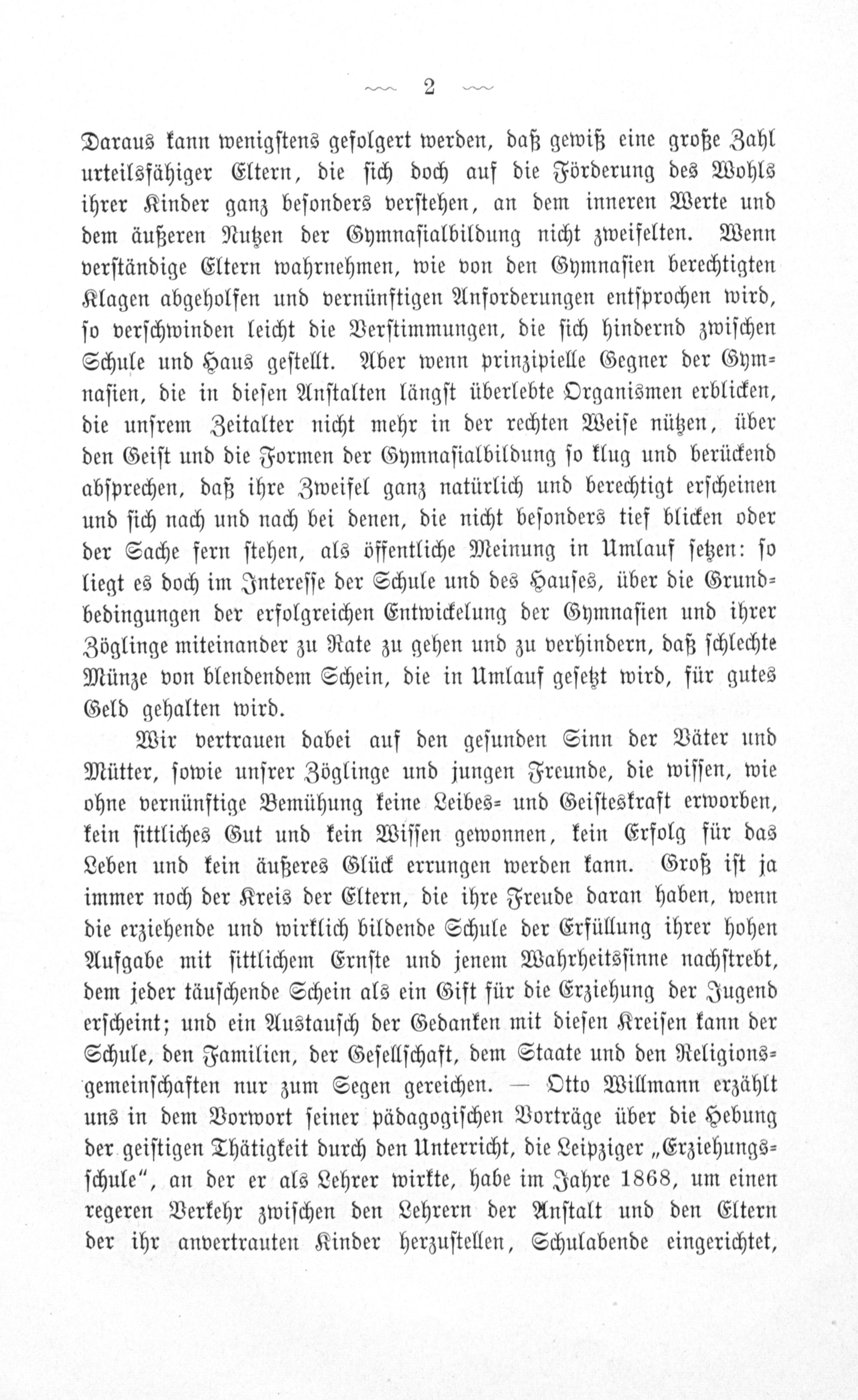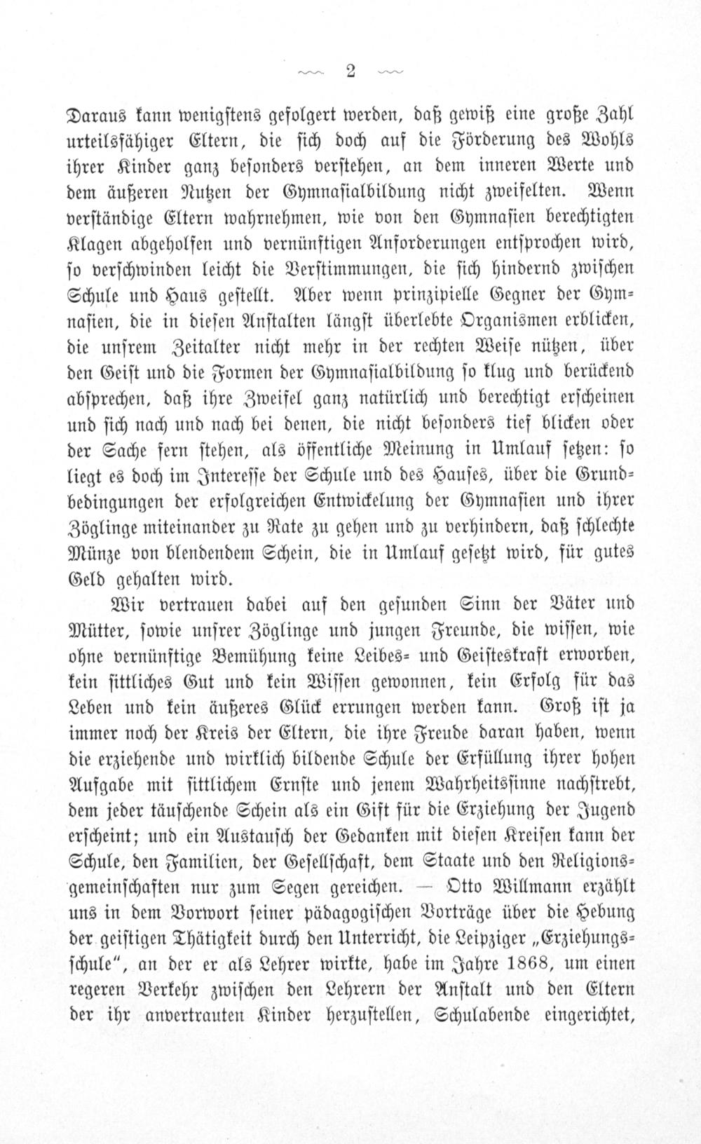 Wir vertrauen dabei auf den geſunden Sinn der Väter und Mütter, ſowie unſrer Zöglinge und jungen Freunde, die wiſſen, wie ohne vernünftige Bemühung keine Leibes⸗ und Geiſteskraft erworben, kein ſittliches Gut und kein Wiſſen gewonnen, kein Erfolg für das Leben und kein äußeres Glück errungen werden kann. Groß iſt ja immer noch der Kreis der Eltern, die ihre Freude daran haben, wenn die erziehende und wirklich bildende Schule der Erfüllung ihrer hohen Aufgabe mit ſittlichem Ernſte und jenem Wahrheitsſinne nachſtrebt, dem jeder täuſchende Schein als ein Gift für die Erziehung der Jugend erſcheint; und ein Austauſch der Gedanken mit dieſen Kreiſen kann der Schule, den Familien, der Geſellſchaft, dem Staate und den Religions⸗ gemeinſchaften nur zum Segen gereichen.— Otto Willmann erzählt uns in dem Vorwort ſeiner pädagogiſchen Vorträge über die Hebung der geiſtigen Thätigkeit durch den Unterricht, die Leipziger„Erziehungs⸗ ſchule“, an der er als Lehrer wirkte, habe im Jahre 1868, um einen regeren Verkehr zwiſchen den Lehrern der Anſtalt und den Eltern der ihr anvertrauten Kinder herzuſtellen, Schulabende eingerichtet,