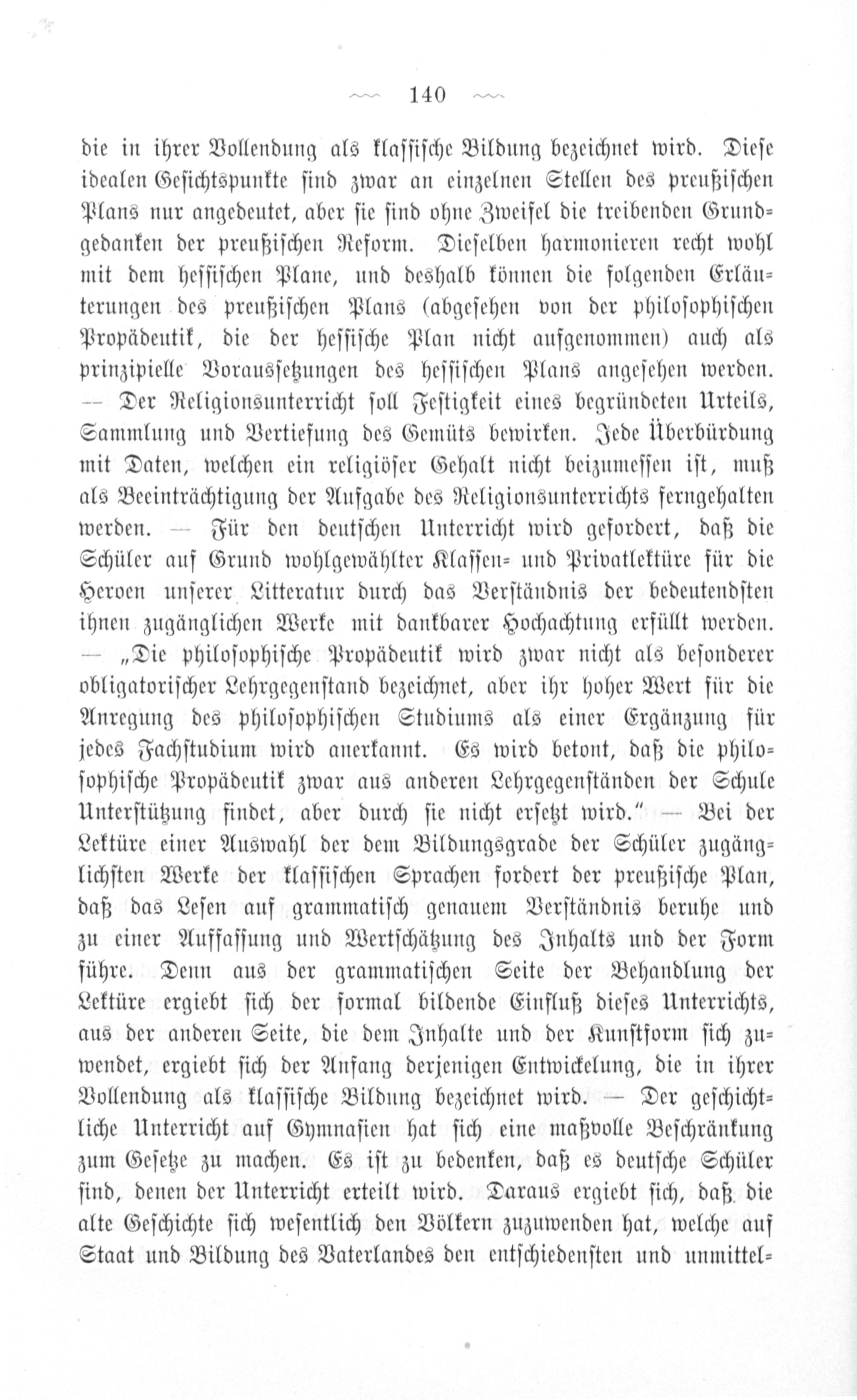 die in ihrer Vollendung als klaſſiſche Bildung bezeichnet wird. Dieſe idealen Geſichtspunkte ſind zwar an einzelnen Stellen des preußiſchen Plans nur angedeutet, aber ſie ſind ohne Zweifel die treibenden Grund⸗ gedanken der preußiſchen Reform. Dieſelben harmonieren recht wohl mit dem heſſiſchen Plane, und deshalb können die folgenden Erläu⸗ terungen des preußiſchen Plans(abgeſehen von der philoſophiſchen Propädeutik, die der heſſiſche Plan nicht aufgenommen) auch als prinzipielle Vorausſetzungen des heſſiſchen Plans angeſehen werden. — Der Religionsunterricht ſoll Feſtigkeit eines begründeten Urteils, Sammlung und Vertiefung des Gemüts bewirken. Jede Überbürdung mit Daten, welchen ein religiöſer Gehalt nicht beizumeſſen iſt, muß als Beeinträchtigung der Aufgabe des Religionsunterrichts ferngehalten werden.— Für den deutſchen Unterricht wird gefordert, daß die Schüler auf Grund wohlgewählter Klaſſen- und Privatlektüre für die Heroen unſerer Litteratur durch das Verſtändnis der bedeutendſten ihnen zugänglichen Werke mit dankbarer Hochachtung erfüllt werden. —„Die philoſophiſche Propädeutik wird zwar nicht als beſonderer obligatoriſcher Lehrgegenſtand bezeichnet, aber ihr hoher Wert für die Anregung des philoſophiſchen Studiums als einer Ergänzung für jedes Fachſtudium wird anerkannt. Es wird betont, daß die philo⸗ ſophiſche Propädeutik zwar aus anderen Lehrgegenſtänden der Schule Unterſtützung findet, aber durch ſie nicht erſetzt wird.“— Bei der Lektüre einer Auswahl der dem Bildungsgrade der Schüler zugäng⸗ lichſten Werke der klaſſiſchen Sprachen fordert der preußiſche Plan, daß das Leſen auf grammatiſch genauem Verſtändnis beruhe und zu einer Auffaſſung und Wertſchätzung des Inhalts und der Form führe. Denn aus der grammatiſchen Seite der Behandlung der Lektüre ergiebt ſich der formal bildende Einfluß dieſes Unterrichts, aus der anderen Seite, die dem Inhalte und der Kunſtform ſich zu⸗ wendet, ergiebt ſich der Anfang derjenigen Entwickelung, die in ihrer Vollendung als klaſſiſche Bildung bezeichnet wird.— Der geſchicht⸗ liche Unterricht auf Gymnaſien hat ſich eine maßvolle Beſchränkung zum Geſetze zu machen. Es iſt zu bedenken, daß es deutſche Schüler ſind, denen der Unterricht erteilt wird. Daraus ergiebt ſich, daß die alte Geſchichte ſich weſentlich den Völkern zuzuwenden hat, welche auf Staat und Bildung des Vaterlandes den entſchiedenſten und unmittel⸗