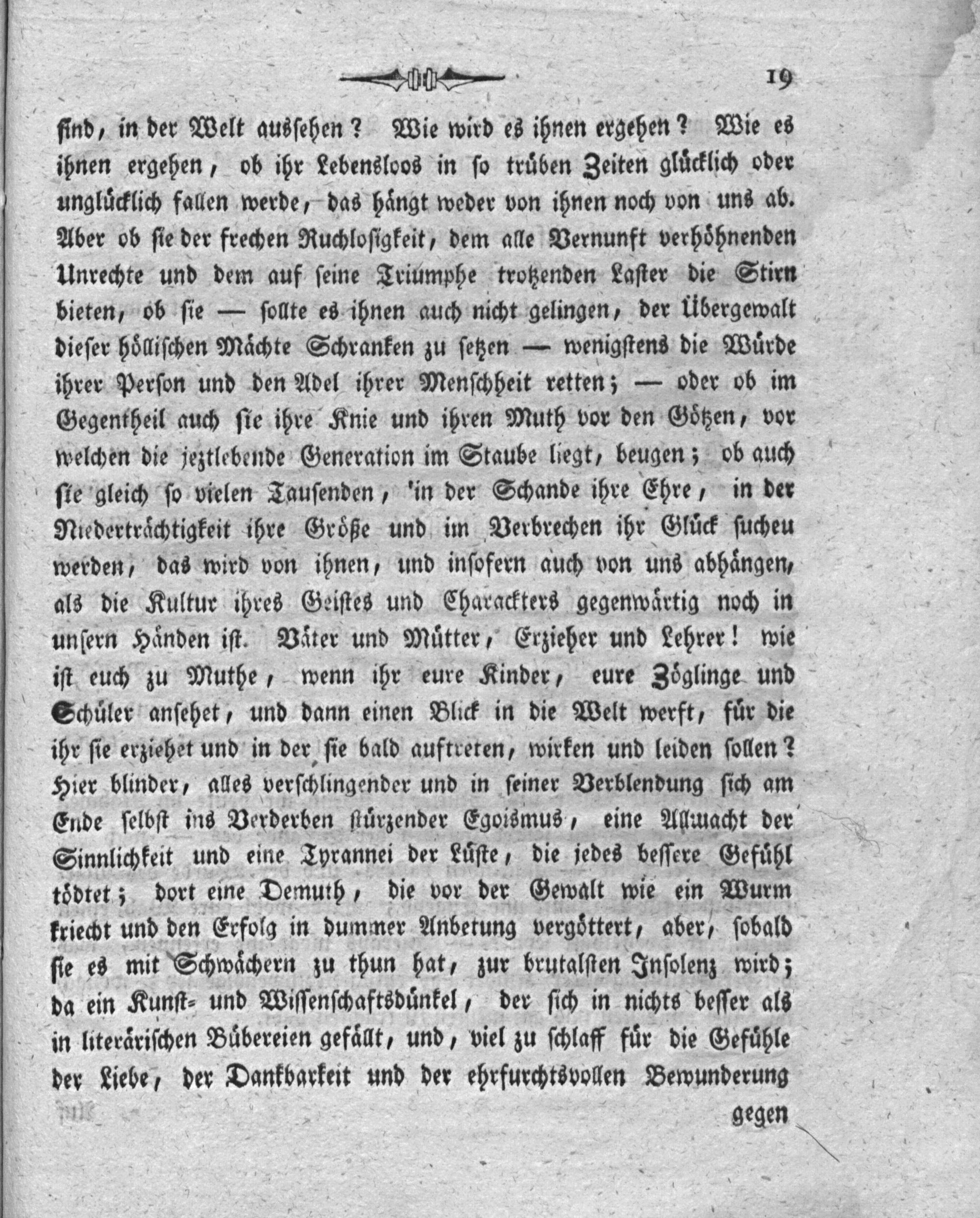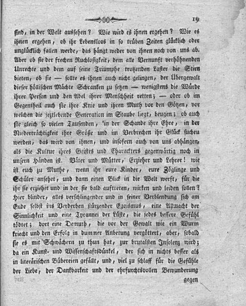 dieſer hoͤliſchen Maͤchte Schranken zu ſetzen— wenigſtens die Wuͤrde ihrer Perſon und den Adel ihrer Menſchheit retten;— oder ob im Gegentheil auch ſte ihre Knie und ihren Muth vor den Goͤtzen, vor welchen die jeztlebende Generation im Staube liegt, beugen; ob auch ſte gleich ſo vielen Tauſenden, iin der Schande ihre Ehre, in der Niedertraͤchtigkeit ihre Groͤße und im Verbrechen ihr Glück ſucheu werden, das wird von ihnen, und inſofern auch von uns abhaͤngen, als die Kultur ihres Geiſtes und Charackters gegenwaͤrtig noch in