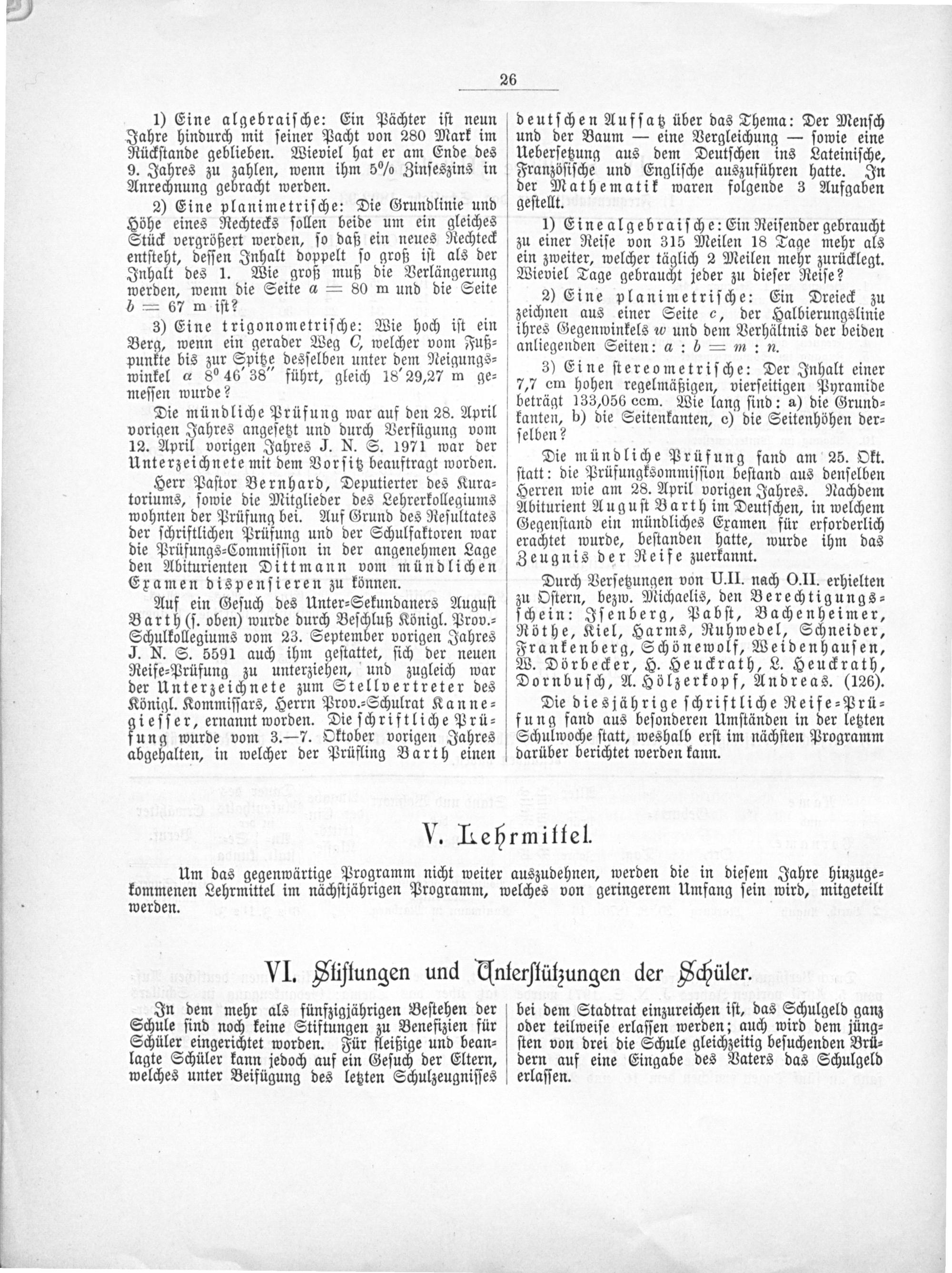 Die mündliche Prüfung fand am 25. Okt. ſtatt: die Prüfungksommiſſion beſtand aus denſelben Herren wie am 28. April vorigen Jahres. Nachdem Abiturient Auguſt Barth im Deutſchen, in welchem Gegenſtand ein mündliches Examen für erforderlich erachtet wurde, beſtanden hatte, wurde ihm das Zeugnis der Reife zuerkannt.