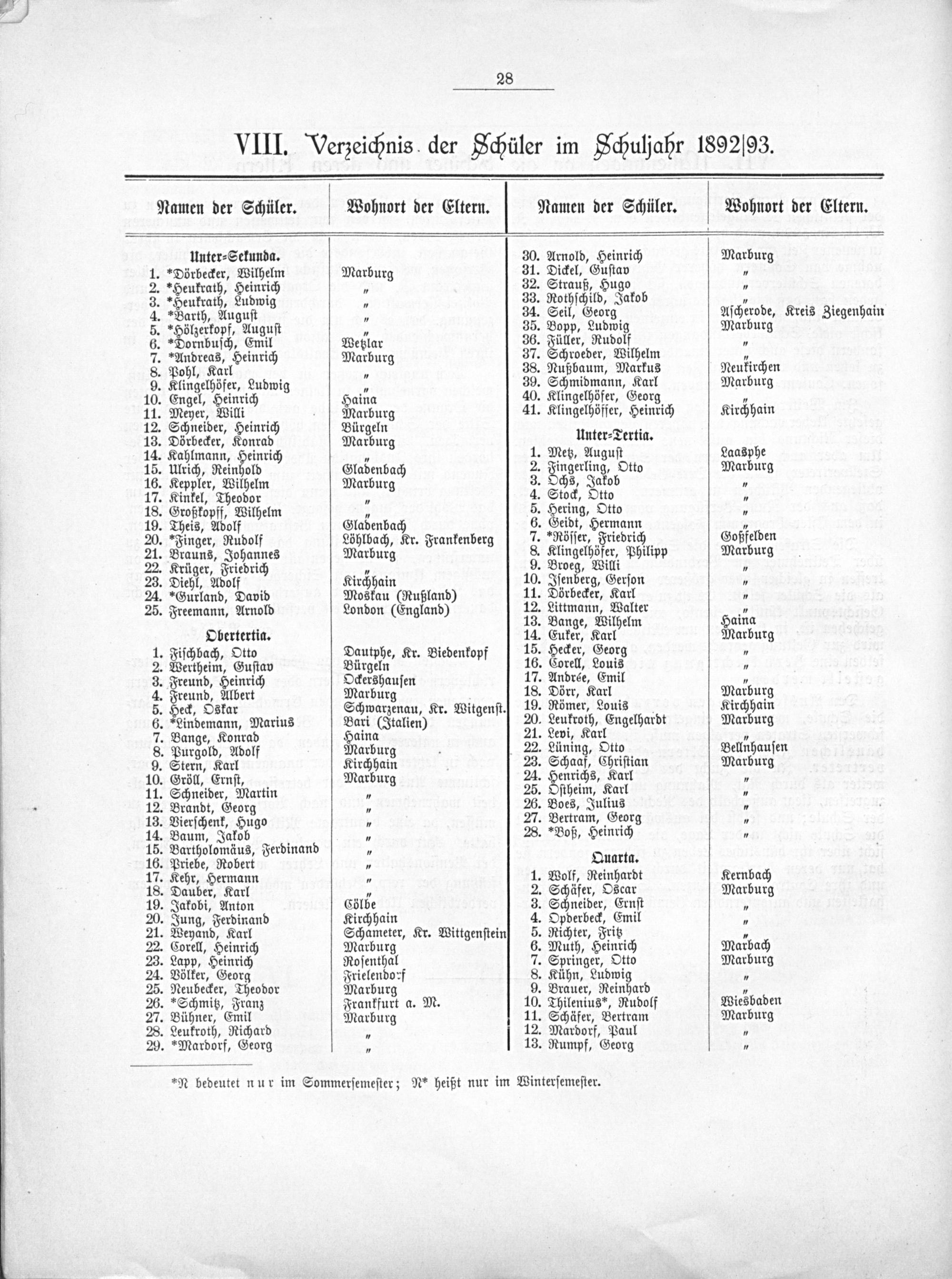 VIII. Verzeichnis der Schüler im Schuljahr 1892/93.