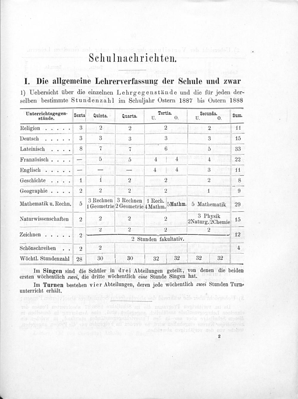 Im Singen sind die Schüler in drei Abteilungen geteilt, von denen die beiden ersten wöchentlich zzcei, die dritte wöchentlich eine Stunde Singen hat.