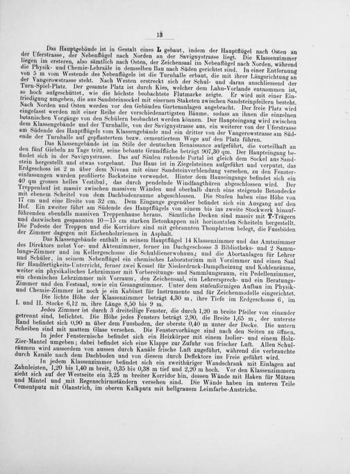 Das Klassengebäude ist im Stile der deutschen Renaissance aufgeführt, die vorteilhaft an den fünf Giebeln zu Tage tritt, seine bebaute Grundfläche beträgt 907,30 qm. Der Haupteingang be- findet sich in der Savignystrasse. Das auf Säulen ruhende Portal ist gleich dem Sockel aus Sand- stein hergestellt und etwas vorgebaut. Das Haus ist in Ziegelsteinen aufgeführt und verputzt, das Erdgeschoss ist 2 m über dem Niveau mit einer Sandsteinverblendung versehen, zu den Fenster- einfassungen wurden profilierte Backsteine verwendet. Hinter dem Hauseingange befindet sich ein 40 qm grosses helles Vestibul, das durch pendelnde Windfangthüren abgeschlossen wird. Der Treppenlauf ist massiv zwischen massiven Wänden und oberhalb durch einé steigende Betondecke mit ebenem Scheitel von dem Dachbodenraume abgeschlossen. Die Stufen haben eine Höhe von 17 cm und eine Breite von 32 cm. Dem Eingange gegenüber befindet sich ein Ausgang auf den Hof. Ein zweiter führt am Südende des Hauptflügels von einem bis ins zweite Stockwerk hinauf- führenden ebenfalls massiven Treppenhause heraus. Sämtliche Decken sind massiv mit T-Trägern und dazwischen gespannten 10— 15 cm starken Betonkappen mit horizontalen Scheiteln hergestellt. Die Podeste der Treppen und die Korridore sind mit gebrannten Thonplatten belegt, die Fussböden der Zimmer dagegen mit Eichenholzriemen in Asphalt.