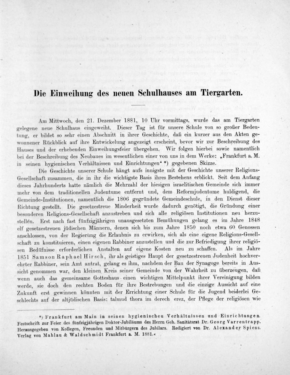 Am Mittwoch, den 21. Dezember 1881, 10 Uhr vormittags, wurde das am Tiergarten gelegene neue Schulhaus eingeweiht. Dieser Tag ist für unsere Schule von so großer Bedeu- tung, er bildet so sehr einen Abschnitt in ihrer Geschichte, daß ein kurzer aus den Akten ge- wonnener Rückblick auf ihre Entwickelung angezeigt erscheint, bevor wir zur Beschreibung des Hauses und der erhebenden Einweihungsfeier übergehen. Wir folgen hierbei sowie namentlich bei der Beschreibung des Neubaues im wesentlichen einer von uns in dem Werke:„Frankfurt a. M. in seinen hygienischen Verhältnissen und Einrichtungen“*) gegebenen Skizze.