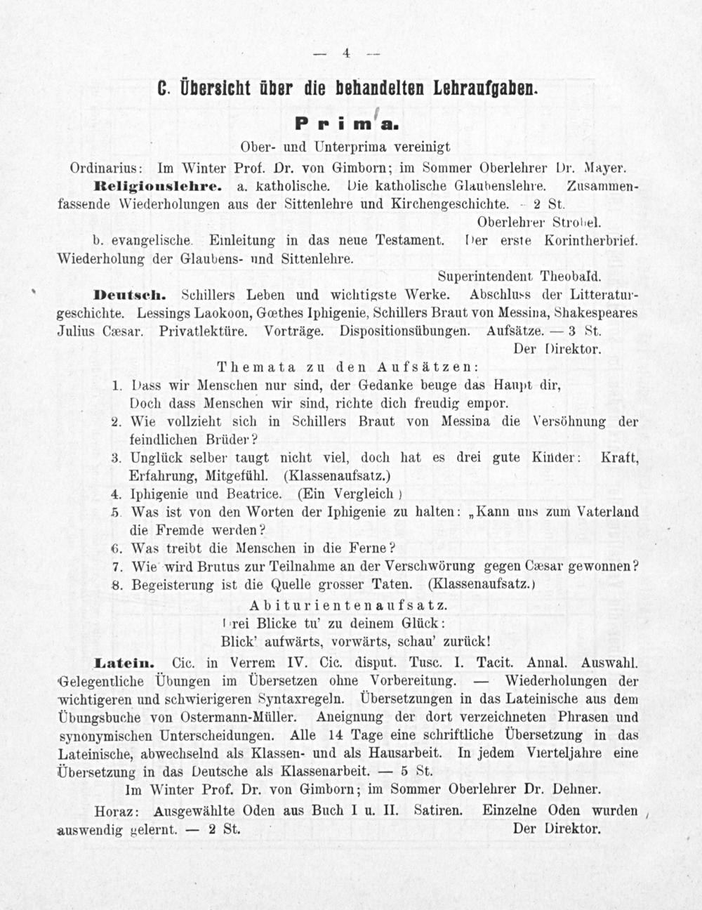 Prim'a. Ober- und Unterprima vereinigt Ordinarius: Im Winter Prof. Dr. von Gimborn; im Sommer Oberlehrer Dr. Mayer. Religiouslehre. a. katholische. Die katholische Glaubenslehre. Zusammen- fassende Wiederholungen aus der Sittenlehre und Kirchengeschichte. 2 St. Oberlehrer Strobel. b. evangelische. Einleitung in das neue Testament. l)er erste Korintherbrief. Wiederholung der Glaubens- und Sittenlehre. Superintendent Theobald. Deutsch. Schillers Leben und wichtigste Werke. Abschluss der Litteratur- geschichte. Lessings Laokoon, Gœthes Iphigenie, Schillers Braut von Messina, Shakespeares Julius Cæsar. Privatlektüre. Vorträge. Dispositionsübungen. Aufsätze.— 3 St. Der Direktor. Themata zu den Aufsätzen: 1. Dass wir Menschen nur sind, der Gedanke beuge das Haupt dir, Doch dass Menschen wir sind, richte dich freudig empor. 2. Wie vollzieht sich in Schillers Braut von Messina die Versöhnung der feindlichen Brüder? 3. Unglück selber taugt nicht viel, doch hat es drei gute Kinder: Kratt, Erfahrung, Mitgefühl.(Klassenaufsatz.) 4. Iphigenie und Beatrice.(Ein Vergleich) 5. Was ist von den Worten der Iphigenie zu halten:„Kann uns zum Vaterland die Fremde werden? 6. Was treibt die Menschen in die Ferne? . Wie wird Brutus zur Teilnahme an der Verschwörung gegen Cæsar gewonnen? 8. Begeisterung ist die Quelle grosser Taten.(Klassenaufsatz.)