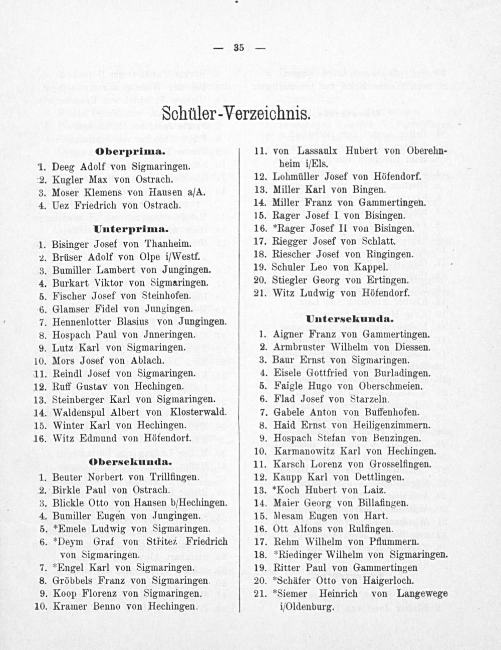 von Lassaulx Hubert von Oberehn- heim i/Els. Lohmüller Josef von Höfendorf. Miller Karl von Bingen. Miller Franz von Gammertingen. Rager Josef I von Bisingen. *Rager Josef II von Bisingen. Riegger Josef von Schlatt. Riescher Josef von Ringingen. Schuler Leo von Kappel. Stiegler Georg von Ertingen. Witz Ludwig von Höfendorf.